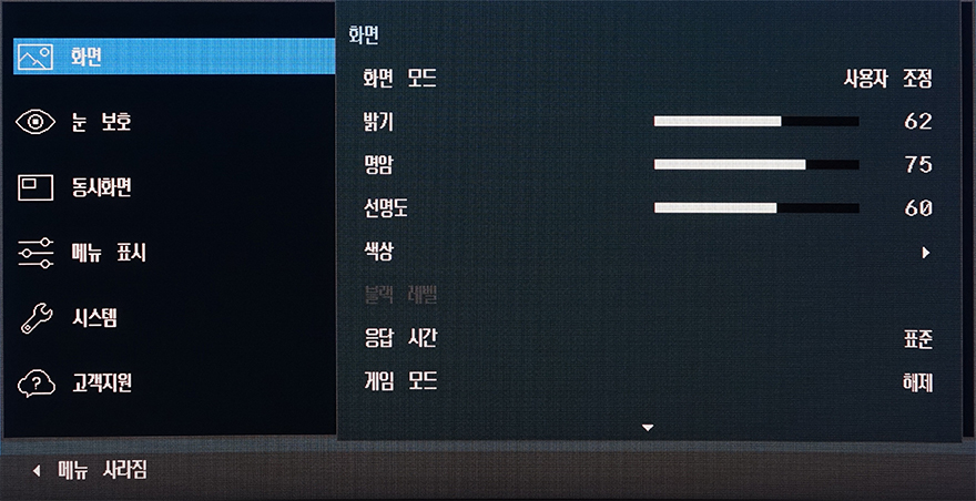 OSD 메뉴는 크게 화면/눈 보호/동시화면/메뉴 표시/시스템/고객지원 6가지 메뉴를 갖추고 있는데, 화면 메뉴에선 화면 모드를 비롯해 밝기, 명암, 선명도, 색상, 응답시간, 게임모드 등 설정을 할 수 있는데, 화면모드와 게임모드는 제품 자체에 프로파일로 설정되어 있는 값을 바로 적용할 수 있는 기능으로 화면 모드는 사용자, 표준화면, 영화, 동영상 명암 4가지를 지원해주고 있습니다. 실제로 사용해보면 화면모드와 게임모드 모두 밝기에 차이를 두고 있다라는 것을 확인할 수 있죠. 또한, 윈도우 운영체제에나 게임상에서 HDR 기능을 활성화 시키면, 화면모드가 HDR 모드로 바뀌는데, 사용자/다이내믹/표준 3가지 지원을 해줍니다. 참고로, 사용자와 표준은 동일한 값을 두고 있어서 차이를 주고 싶다면 사용자가 밝기 등의 설정값을 변경해주면 됩니다. 응답시간은 표준, 빠르게, 가장 빠르게 3가지를 지원하고 있습니다.