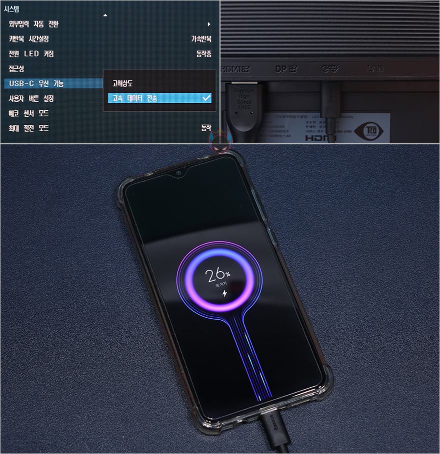그리고, USB Type-C 포트 같은경우 우선 기능에서 고속충전 및 데이터 전송을 할지, 고해상도로 사용할지 선택할 수 있는데, 기본적으로는 고속 데이터 전송으로 설정되어 있으며, 실제로 USB Type C-to-C 케이블을 사용해서 외부 기기를 연결해보면, 고속충전을 지원해주는 것을 확인할 수 있습니다. 마지막으로 고객지원 메뉴에선 자가진단, 업데이트, 현재 모니터 연결상태 정보, 초기화 기능이 있는데, 참고로 현재 삼성 홈페이지에 아직까지 이번 S6 시리즈 모니터 제품이 등록되어 있지 않은 상태이기 때문에, 최신 업데이트 파일은 없는 상황입니다. 만약, 최신 업데이트 진행이 생긴다면, USB메모리에 파일을 담아서 업데이트 진행을 해주면 됩니다. 물론, 앞서 본 모니터 후면 USB 3.0포트에 연결해서 말이죠.