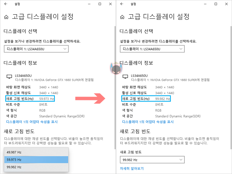 삼성 S6 S34A650U 모니터가 게임용 컨셉 모니터는 아니지만, 그래도 커브드가 적용된 모니터인만큼 게임을 안할 수는 없겠죠. 그래서, 화면주사율 지원을 살펴보면, 최대 100Hz까지 지원해주는 것을 확인할 수 있는데, 기본 제공되는 HDMI 케이블로 연결 했을 시 기본 작동 주사율은 60Hz이기 때문에, 사용자가 100Hz 주사율로 변경을 해줘야 합니다. 그리고, 실제 100Hz로 적용했을 때, 프레임을 확인해보면 부드러운 화면을 보여주기 위해서 프레임 이미지 간격이 더 촘촘한 것을 확인할 수 있죠.