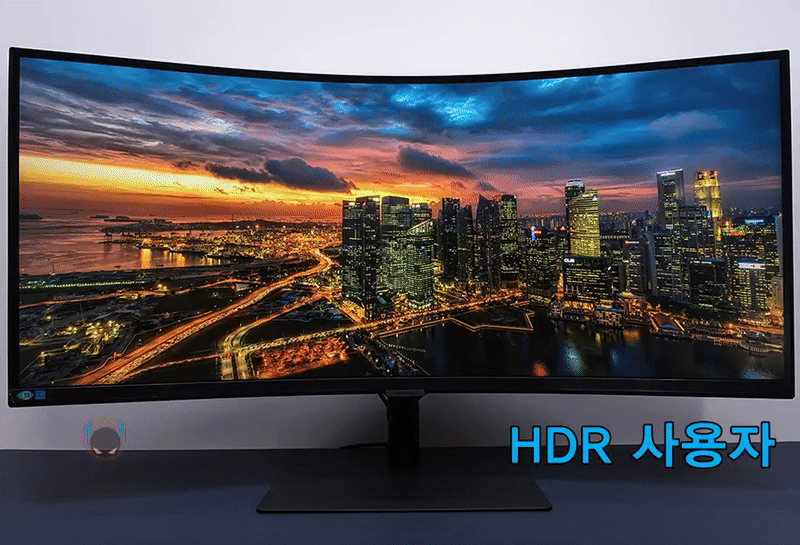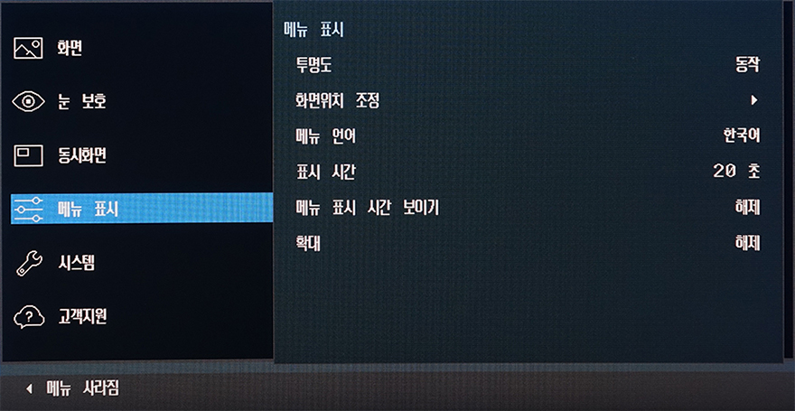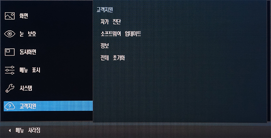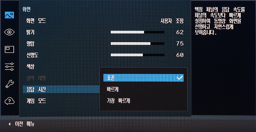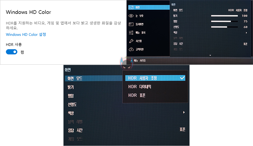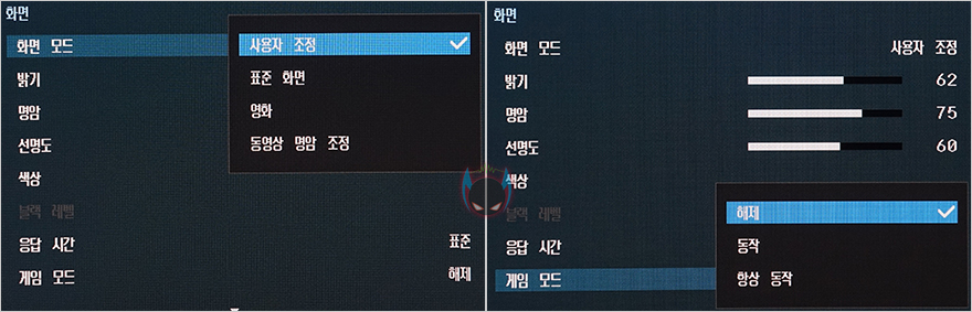 OSD 메뉴는 크게 화면/눈 보호/동시화면/메뉴 표시/시스템/고객지원 6가지 메뉴를 갖추고 있는데, 화면 메뉴에선 화면 모드를 비롯해 밝기, 명암, 선명도, 색상, 응답시간, 게임모드 등 설정을 할 수 있는데, 화면모드와 게임모드는 제품 자체에 프로파일로 설정되어 있는 값을 바로 적용할 수 있는 기능으로 화면 모드는 사용자, 표준화면, 영화, 동영상 명암 4가지를 지원해주고 있습니다. 실제로 사용해보면 화면모드와 게임모드 모두 밝기에 차이를 두고 있다라는 것을 확인할 수 있죠. 또한, 윈도우 운영체제에나 게임상에서 HDR 기능을 활성화 시키면, 화면모드가 HDR 모드로 바뀌는데, 사용자/다이내믹/표준 3가지 지원을 해줍니다. 참고로, 사용자와 표준은 동일한 값을 두고 있어서 차이를 주고 싶다면 사용자가 밝기 등의 설정값을 변경해주면 됩니다. 응답시간은 표준, 빠르게, 가장 빠르게 3가지를 지원하고 있습니다.
