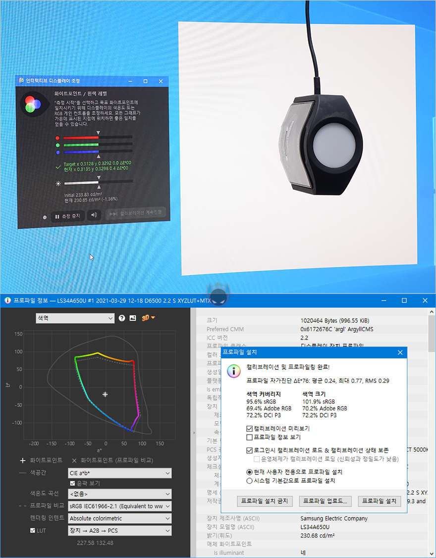 이제, 삼성 S6 S34A650U 모니터를 실사용 해봐겠죠?! 일단, 모니터 기본품질 확인으로 몇 가지를 확인해보는데, S6 S34A650U 모니터 같은경우 VA패널이 사용되었습니다. 그래서, VA패널의 최대 장점이라 할 수 있는 빛샘현상은 당연히 없습니다. 그리고, 불량화소도 없고, 명암비, 색상비도 이상없으며, 178˚의 광시야각도 잘 나타내주고 있습니다. 또한, S6 S34A650U 모니터는 전문가용, 게임용 컨셉의 모니터가 아니라서 제품사양에 색재현율에 대한 언급이 없는데, 실제로 캘리브레이션을 진행해 측정해 본 결과, sRGB 95.6%로 S6 S34A650U 모니터가 일반 가정용/사무용 목적의 기본 모니터형태라는 점에서 충분히 일반 소비자들이 인터넷 웹이나 게임으로 사용하기에는 부족하지 않은 색재현율을 해줍니다. DCI-P3도 70%가 넘어서 일반 소비자들이 영상을 시청하기에는 무리가 없는 수준입니다.