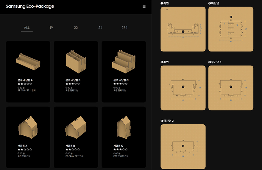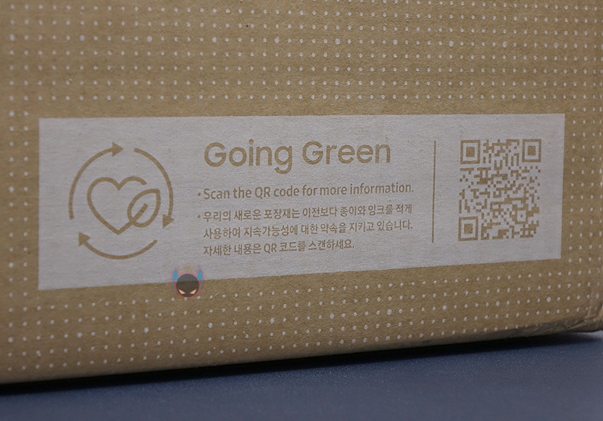 제품박스부터 살펴보면, 삼성이라는 브랜드가치를 생각하면 박스디자인이 단순하죠. 이유가 있습니다. 박스 한쪽에 Going Green이라는 문구를 확인할 수 있는데, 바로 지구환경을 생각해서 포장재 즉 종이는 재활용, 그리고 잉크를 적게 사용한거죠. 최근에 삼성 가전제품을 구입해서 사용한 분들이라면 이미 잘 알고 있는 부분일겁니다. 특히, Going Green 표기에 함께 실린 QR코드로 접속하거나 삼성 에코팩키지 홈페이지로 직접 접속하면 자사 제품 종이박스를 재단해서 생활소품으로 만드는 방법을 알려줍니다. 그래서, 제품박스 표면에 재단역할로 일정 간격 도트 디자인을 적용하고 있죠.