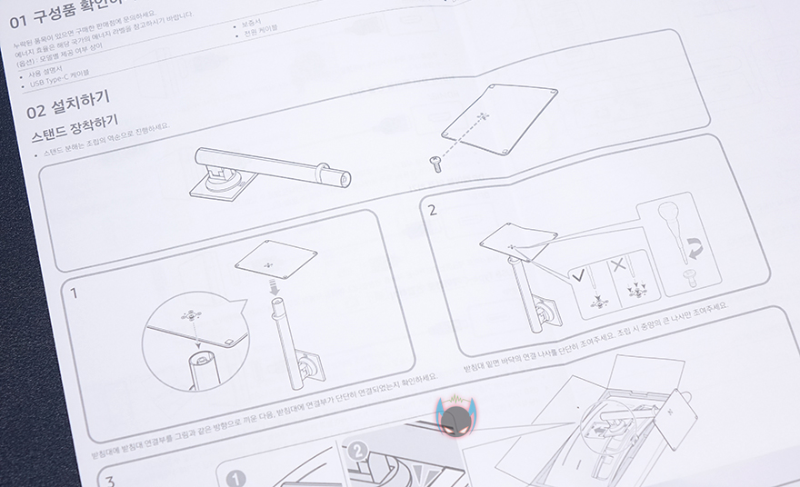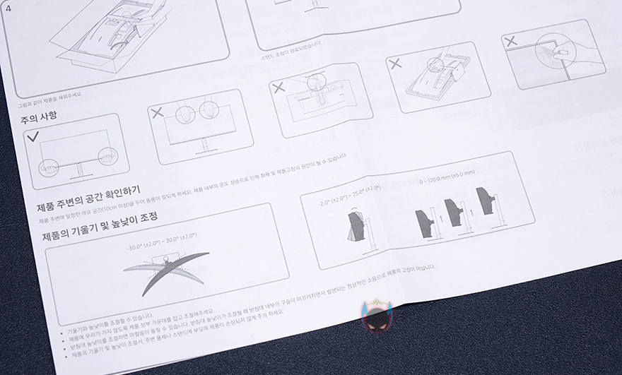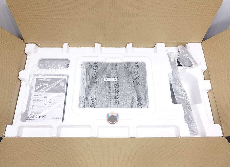 아무튼 그래서, 제품박스는 크게 화려하지 않지만, 제품의 주요 정보들은 담고 있습니다. 사이즈, 곡면율, 포트 지원, 운영체제 지원, 스탠드 기능 등을 표기해놨죠. 박스를 열어보면, 포장은 파손방지를 위해 스티로폼 소재가 사용되었습니다. 그리고, 구성품들은 모두 밀봉 포장을 했는데, 구성품에는 제품설명서 및 인증서/보증서, 전원케이블, HDMI, USB Type C-toC 케이블로 이루어져 있죠. 인증서에선 TCO인증을 확인할 수 있는데, 삼성 같이 글로벌 브랜드로 가치가 있는 대기업들은 대부분 IT제품에 지속적인 환경에 책임감 역할로 에코레벨이라 불리는 TCO인증을 받는 편입니다. 그리고, 제품설명서에는 당연히 모니터와 스탠드 조립법이 실려있죠. 또한, 스탠드 조절을 할 때 주의사항으로 아랫부분을 만지라고 언급하는데, 이부분은 뒤에서 다시 언급하겠습니다.