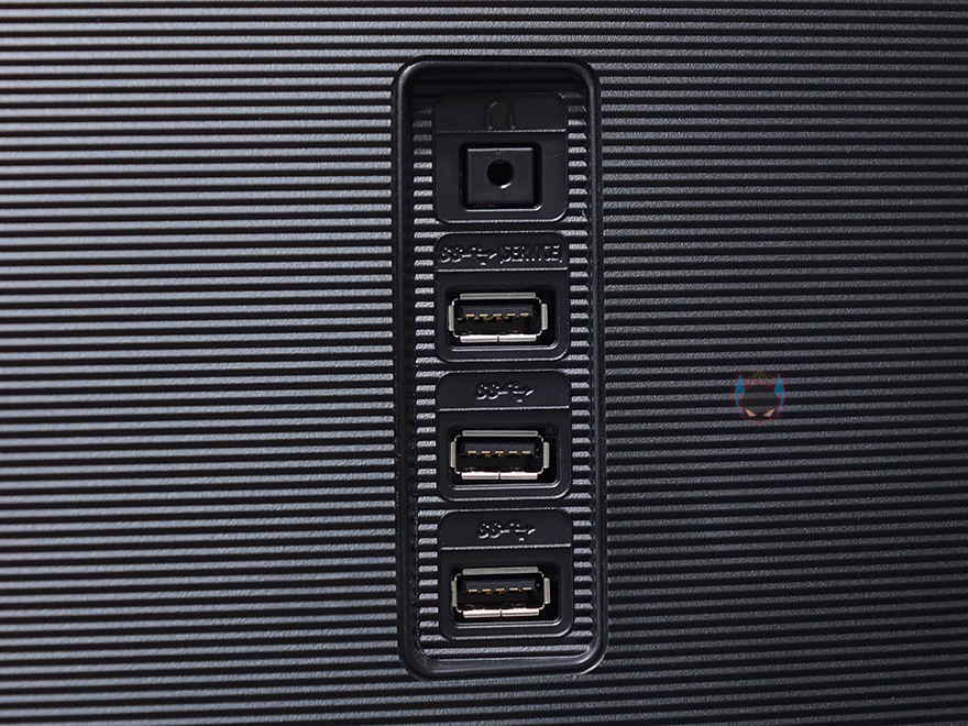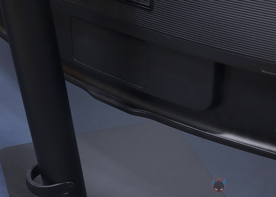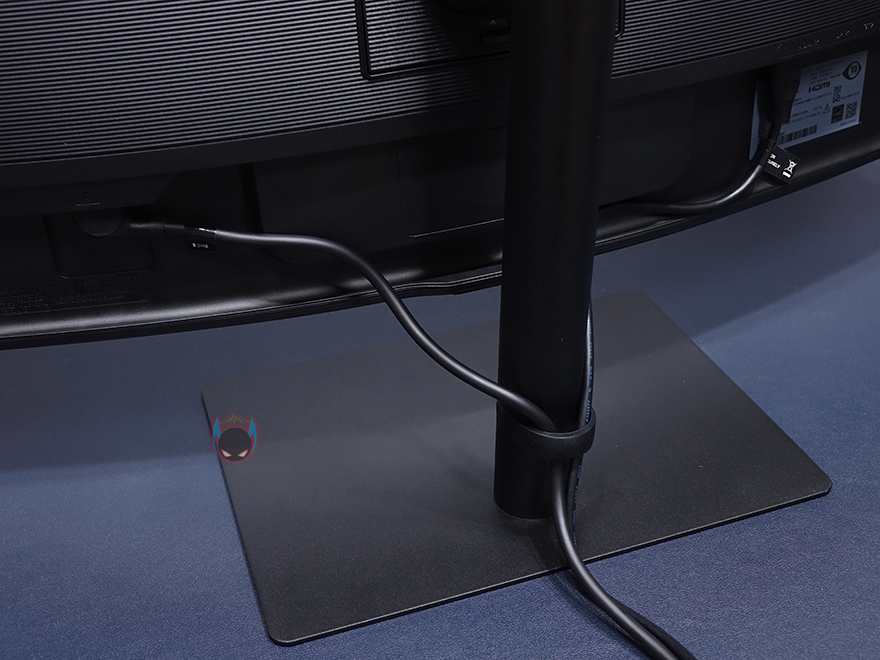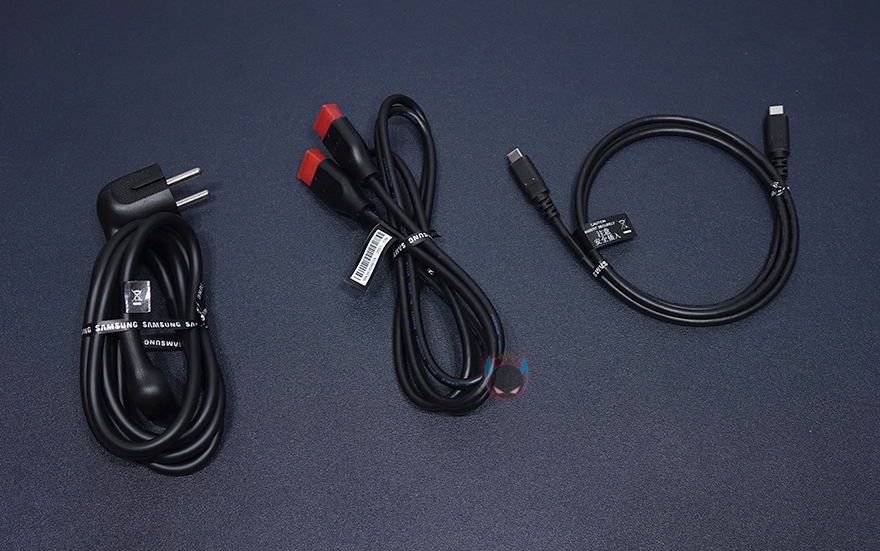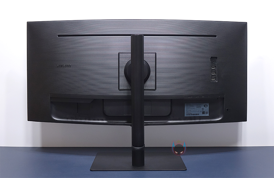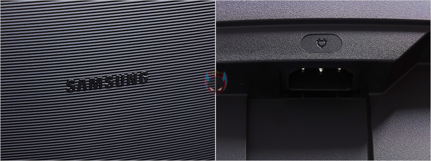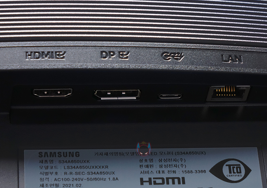 모니터 후면에는 스탠드를 기준으로 왼쪽으로는 중앙위치쯤에 삼성 로고를 적용해놨으며, 그대로 아랫부분에는 전원케이블과 연결되는 포트가 배치되어 있습니다. 그리고, 오른쪽으로는 로고와 같은 위치에 헤드폰 포트와 USB 3.0 포트 3개가 배치되어 있습니다. 그리고, 역시 아랫부분에는 모니터 출력포트로 HDMI 2.0 포트, DP 1.2 포트가 배치되어 있으며, USB Type-C 포트, LAN 포트도 적용되어 있죠. 참고로, USB Type-C 포트는 고속충전 지원으로 최대 90W까지 지원합니다. 그리고, LAN포트 같은경우에는 스마트TV 같은 기능을 해주는 것이 아니라 인터넷 LAN과 연결해서, USB Type-C 포트에 기기를 연결했을 시 인터넷 연결을 도와주는 역할을 합니다. 마지막으로 스탠드 연결부 후면에는 케이블 사용시 묶을 수 있는 고무밴드 홀더장치도 적용되어 있죠.