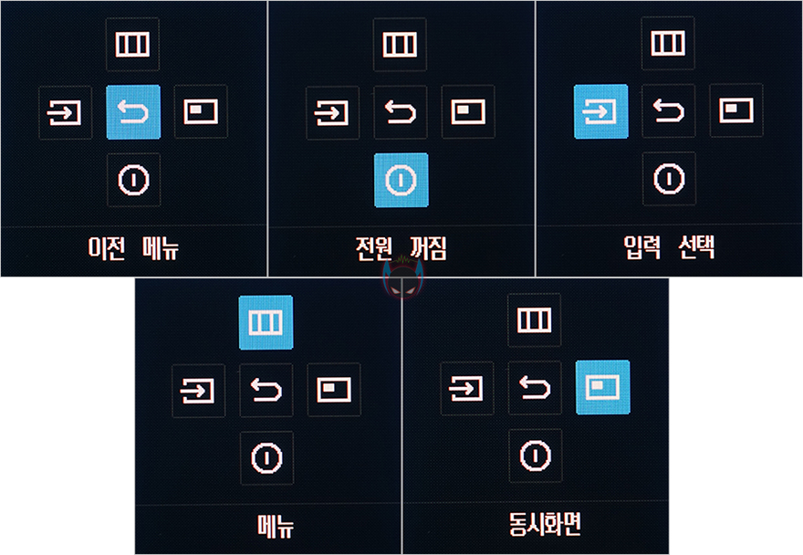 이번엔 삼성 S6 S34A650U 모니터에 탑재된 기능 및 OSD 메뉴들을 살펴보는데, 앞서 확인한 버튼 구성에서 가운데 전원버튼을 누르면 이전 메뉴/전원 꺼짐/입력 선택/메뉴/동시화면 이렇게 5가지 기본 메뉴가 나옵니다. 입력선택은 외부 입력 전환으로 앞서 포트 구성에서 확인한 HDMI와 DP, 그리고, USB Type-C 포트까지 PC 및 노트북 등 외부 기기와 연결되어 있는 상태라면 바로 포트 선택을 해서 화면 전환을 할 수 있습니다.