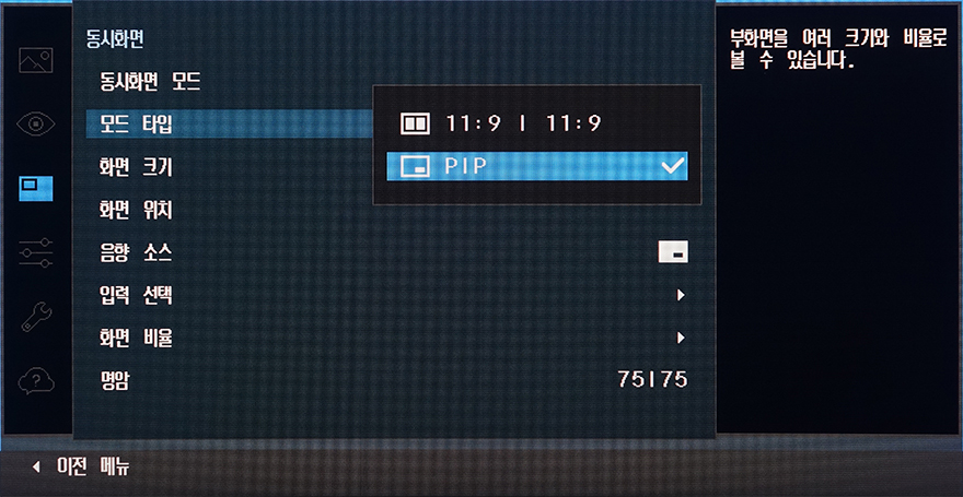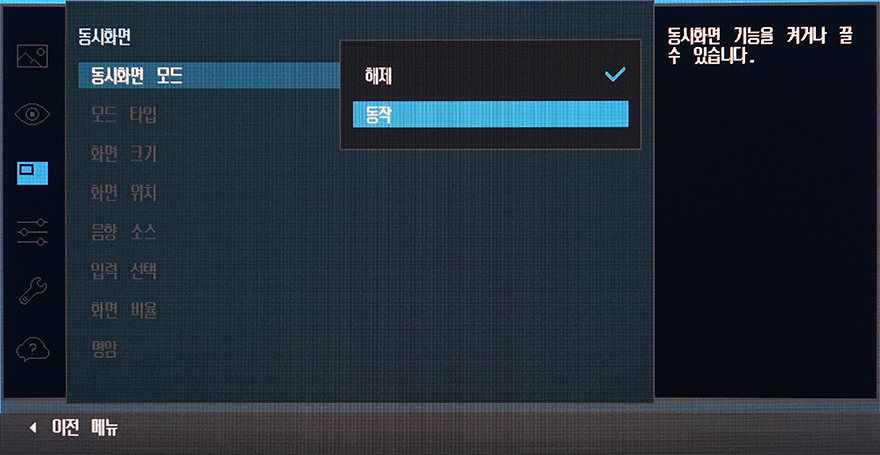 또한, 동시화면 같은경우에는 OSD 메뉴 중 바로 동시화면 모드로 이동해서 해제와 동작을 선택할 수 있는데, 기본 PC외에 노트북 같은 외부기기와 함께 연결되어 있다면, 동작(활성화)을 선택해서 PC화면과 노트북 화면을 동시에 볼 수 있게 해줍니다. 기본적으로는 11:9비율(PBP)로 좌우 화면을 나누어서 보여주지만, PIP 기능도 지원하기 때문에 크기 선택과 함께 4곳에 위치 선택까지 설정 할 수 있습니다.