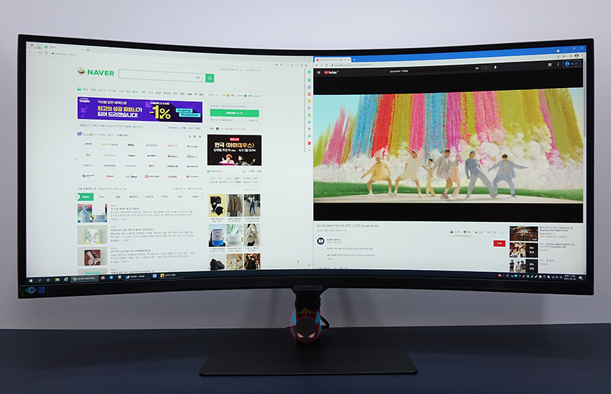 끝으로 실제 편집 작업이나 웹, 게임, 영상 등에서 사용해보면, 34인치 울트라 와이드모니터임에도 1000R 곡면율을 가지고 있어서, 평균적으로 모니터와 거리는 두는 최소 50cm 거리에서도 한눈에 화면이 다 들어옵니다. 그래서, 편집 작업을 할 때는 확실히 넓은 영역을 사용할 수 있어서 작업에 수월함이 있고, 인터넷이나 프로그램 같은 실행 사용 시에도 화면 영역을 나누어서 사용하기에도 효율적입니다. 게임이나 영상 같은경우에는 해당 프로그램에서 비율설정을 할 수 있기 때문에, 21:9 비율로 사용하거나 16:9비율로 사용하는건 선택이라 할 수 있겠는데, 게임은 대부분 화면비율에 맞춰서 최적화로 그래픽설정이 지원되기 때문에 21:9 비율이 어색하지는 않습니다. 반면에 영상 같은경우에는 16:9 비율이 보편적이기 때문에 21:9 나 32:9 비율 같은 울트라 와이드모니터에선 대부분 처음 영상을 봤을 때 퍼진 느낌을 받을 수 있는데, 그래도 S6 S34A650U 모니터 같은경우엔 21:9 비율에 1000R 곡면율까지 있어서 16:9 비율과 비교해서 퍼진 느낌이 크지 않아, 계속 보게 되면 이질감은 크게 들지 않습니다.