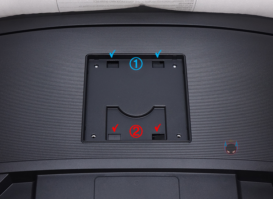 그럼, 모니터 사용전에 스탠드 결합을 해야겠죠. 조립은 간단합니다. 일단, 스탠드 받침대에 모니터와 받침대를 연결해주는 연결부(봉)를 끼워서 받침대 밑바닥부분에 있는 나사를 조여줍니다. 그럼, 스탠드와 연결부 조립은 끝난거죠. 그다음 모니터 후면에 연결부를 결합해주면 되는데, 모니터는 박스에서 꺼내서 결합하는게 아니라 박스안에 들어있는 상태에서 모니터 후면부에 위아래로 위치한 구멍(1번,2번)에 맞춰서 끼워주면 됩니다. 위에서부터 끼우고 아래를 끼워주면 되죠. 연결부 후면에 분리 레버장치가 있어서 나중에 모니터와 분리할 때도 쉽게 분리가 됩니다. 모니터까지 연결을 마친 후에는 그대로 박스에서 꺼내서 사용하면 됩니다.
