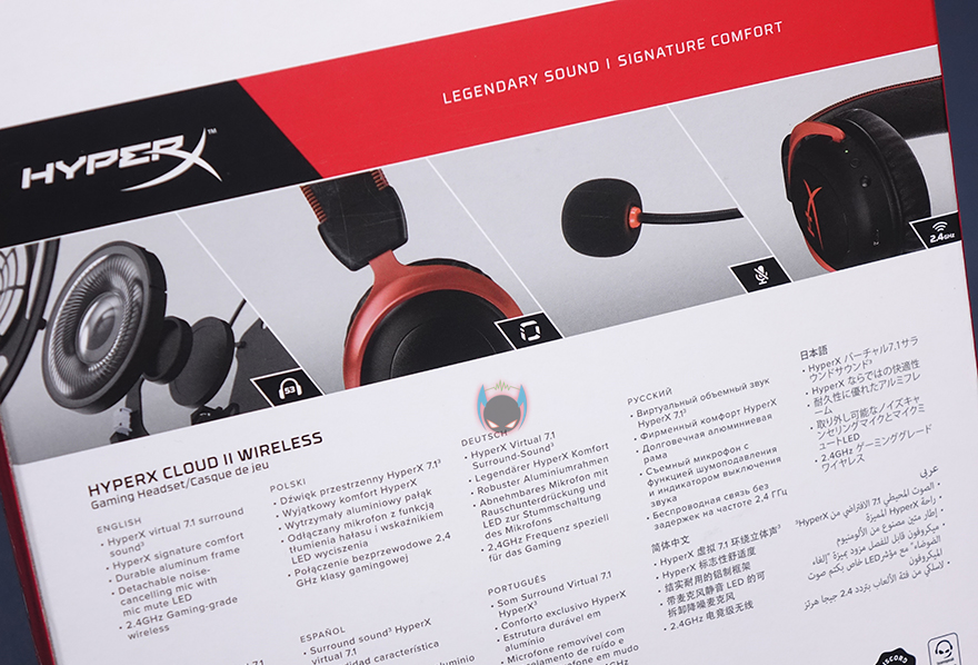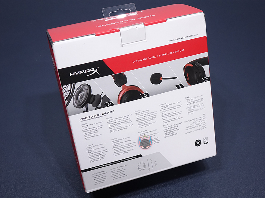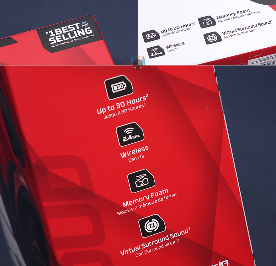 제품박스는 기존의 제품들과는 조금 달라진 느낌의 디자인을 가지고 있지만, 기본 베이스는 HyperX 특유의 레드색상 바탕을 적용하고 있습니다. 그리고, 박스 전면에는 모델명과 제품이미지를 확인할 수 있고, 컨셉문구에 Legendary Sound라는 문구가 이 제품의 모든 것을 말해주죠. 물론, 박스 오른쪽 상위에 미국시장 판매 1위라는 위상의 표기도 확인할 수 있습니다. 그리고, 제품의 주요특징으로 최대 30시간 사용과 편안한 착용감의 메모리폼, 무선 연결방식, 가상 서라운드사운드를 강조하고 있죠. 박스 후면에도 동일한 특징을 이미지를 첨부해 언급하고 있습니다.