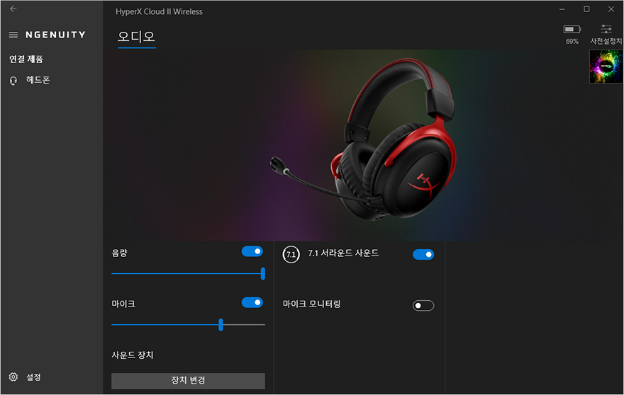 그럼, 실제로 HyperX 클라우드2 무선 헤드셋을 사용해봐야겠죠. 기존의 자사 무선 헤드셋 제품들처럼 USB수신기를 PC나 콘솔기기 등 외부기기에 연결하고, 헤드셋에 전원버튼을 켜면 알아서 자동으로 연결이 됩니다. 연결이 되지 않았을 때는 전원버튼 왼쪽에 위치한 LED 인디케이터가 숨쉬기모드처럼 천천히 깜빡입니다. 그리고, 연결된 상태에서 전원버튼을 번갈아 가면서 누르면 가상 7.1채널 서라운드 기능을 On/Off 할 수 있죠. 마이크는 LED 적용을 통해 마이크 On/Off 상태를 확인할 수 있으며, 무선 제품 역시 HyperX의 공용 소프트웨어 NGenuity를 통해 방금 언급한 기능들을 모두 설정할 수 있으며, 배터리 잔량 상태도 확인할 수 있습니다.