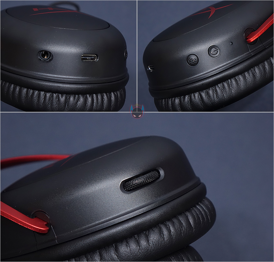 이어-컵부분은 기존 유선 제품과 마찬가지로 바깥쪽에 HyperX 로고를 새겨놨으며, 왼쪽 이어-컵 부분에는 분리형 마이크와 연결되는 포트, 그리고 USB충전케이블과 연결되는 USB Type-C 포트, 마이크 On/Off 버튼, 전원버튼이 배치되어 있으며, 오른쪽 이어-컵에는 볼륨조절이 배치되어 있습니다. 볼륨조절은 스무스한 움직임을 가지고 있어서 조절하기에 편합니다. 그리고, 이어-컵 안쪽의 이어-패드는 귀를 완전히 덮는 밀폐형으로 타워형 모양을 가져서 실제로 착용했을 때 귀를 제대로 덮어주고 있어서, 사운드 없이도 착용했을 때와 착용하지 않았을 때의 외부소음 차이가 느껴지고, 내부에 드라이버 유닛은 기존 유선과 동일하게 53mm 네오디뮴 유닛이며, 60Ω 임피던스를 가졌습니다.
