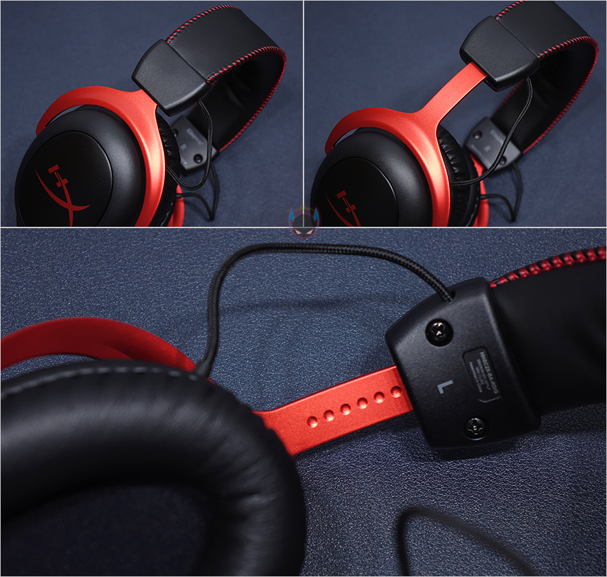 외관상 기존의 유선 제품과 디자인에 차이를 두는 곳이라면, 바로 헤드밴드와 이어-컵을 연결하는 메탈 프레임입니다. HyperX 고유의 레드색상 메탈 프레임을 사용했지만, 기존 제품들은 프레임 디자인이 윤곽이 없는 민무늬형태였던 반면에 이번 클라우드2 무선 제품은 마치 이어-컵 안쪽을 프레임이 받쳐주는 듯한 윤곽으로 디자인을 적용했습니다. 그리고, 이어-컵 양쪽 연결부도 기존 제품들은 별도의 마감재질을 추가로 적용했던 반면에 이번 클라우드2 무선은 바로 메탈 프레임이 끝까지 이어-컵과 바로 연결되는 형태로 처리했습니다. 물론, 프레임은 길이조절을 갖추고 있고, 기존 제품들과 마찬가지로 약 35mm까지 늘어납니다. 또한, 프레임 안쪽에 홈처리를 해서 길이조절을 할 때 걸리는 느낌이 나도록 해놨죠.