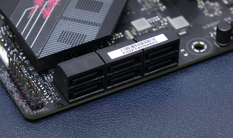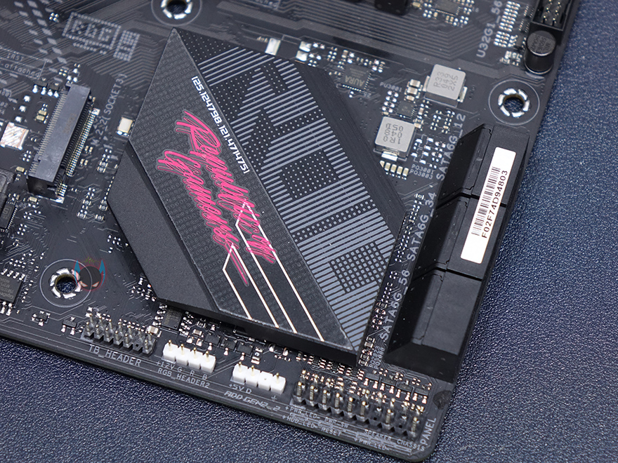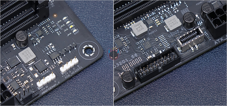 메모리 슬롯은 총 4개로 최대 128GB 용량까지 갖출 수 있으며, 이번 560 칩셋 메인보드의 가장 큰 특징으로 메모리 오버클럭이 가능해져서 최대 5,000MHz 클럭까지 지원을 해주고 있습니다. 그리고, 슬롯 주변을 잠깐 살펴보면, 부팅 시 작동상태를 체크해주는 LED와 12V RGB 헤더, 5V ARGB 헤더가 적용된 것을 확인할 수 있고, USB 3.2 Type-A 내부헤더와 USB 3.2 Type-C 내부헤더도 적용된 것을 확인할 수 있죠. 또한, 그대로 아래로 내려가면 B560칩셋 부분에 방열판이 장착된 것을 확인할 수 있고, 역시 주변으로 썬더볼트 헤더, 12V RGB헤더와 5V ARGB 헤더가 추가로 하나씩 더 적용된 것을 확인할 수 있으며, S-ATA 커넥터 6개 배치도 확인할 수 있습니다. B560칩셋 메인보드지만 RGB 헤더지원이 상급모델 못지 않게 갖춘 것이 개인적으로 마음에 들었습니다.