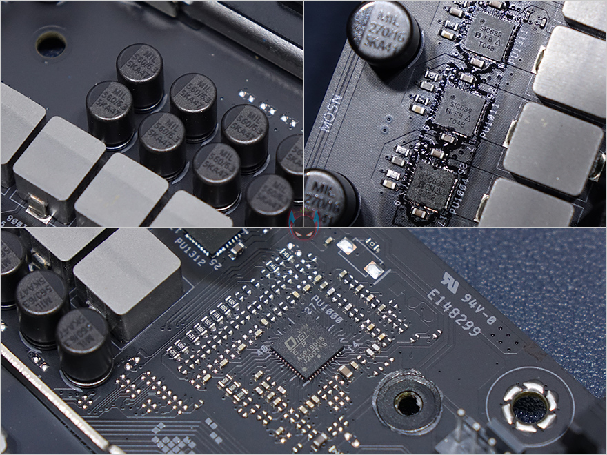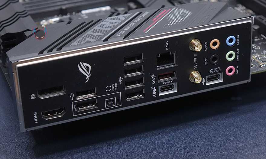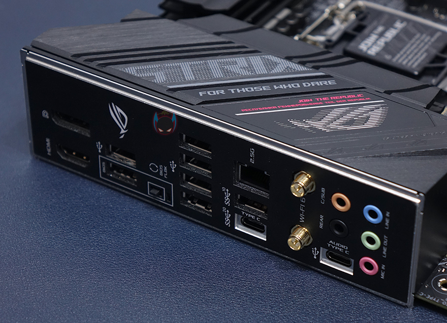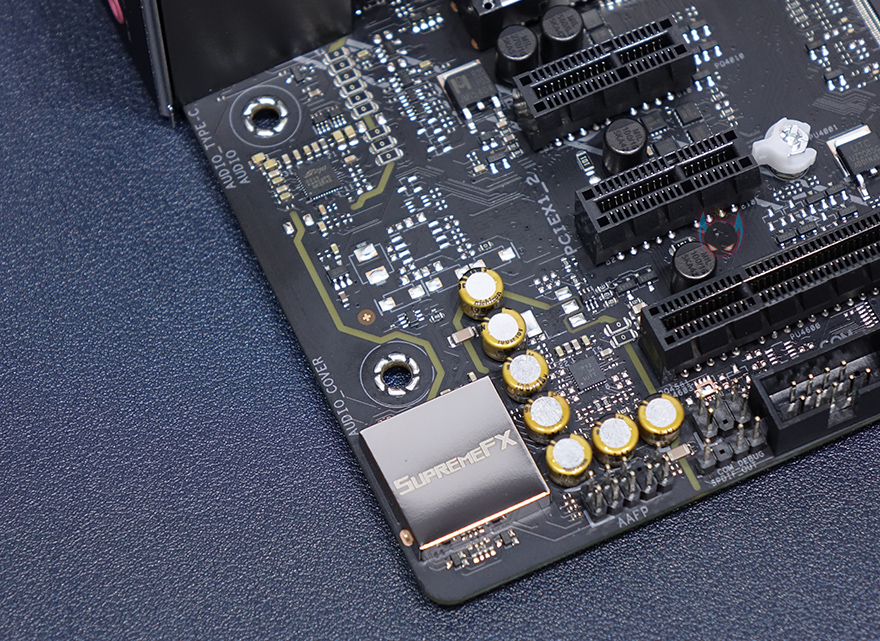내장 오디오부분은 기본적으로 독립PCB방식으로 처리 적용해놨으며, 7.1채널 사운드까지 지원합니다. 물론, 콘덴서들은 일본산을 적용하고 있죠. 마지막으로 백패널 I/O 포트 구성을 살펴보면, 모니터 출력 포트는 HDMI와 디스플레이 포트(DP), CPU가 장착되지 않은 상태에서도 바이오스를 업데이트 할 수 있는 플래시백 버튼, USB 2.0 포트 6개, USB 3.2 Gen2x2 Type-C 포트와 Type-A 포트, 오디오 USB Type-C포트, 기본 오디오 포트, 2.5Gb 랜 포트, 와이파이6 안테나 헤더가 적용된 것을 확인할 수 있습니다.