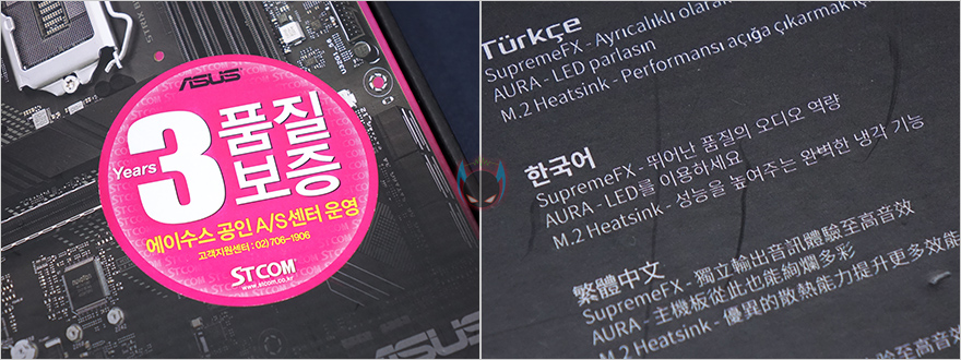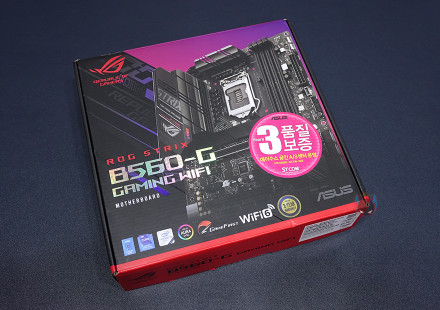 ASUS의 ROG 라인업 모델들은 대부분 제품박스에 모델명을 홀로그램식으로 표기를 해놓죠. ROG Strix B560-G Gaming WiFi 모델 역시 제품박스에 모델명을 홀로그램식으로 표기해놨습니다. 그리고, 시작에서 잠깐 언급했듯이 이 모델은 M-ATX 플랫폼 크기를 가졌는데, 일반적으로 칩셋명뒤에 그러니깐 B560 바로 뒤에 M 약자를 붙이는데, ROG Strix B560-G Gaming WiFi 모델은 M 약자가 없습니다. 물론, 꼭 붙여야한다라는 법도 없죠. 그리고, 인텔 11세대 CPU 지원과 ASUS AURA Sync, 와이파이 6 등의 주요 특징과 국내 정식유통사인 STCOM(stcom.co.kr)의 정품스티커를 전면에서 추가로 확인할 수 있으며, 박스 측면에도 국가별 언어로 추가 특징을 표기해놨는데, 한국어도 포함되어 있습니다.