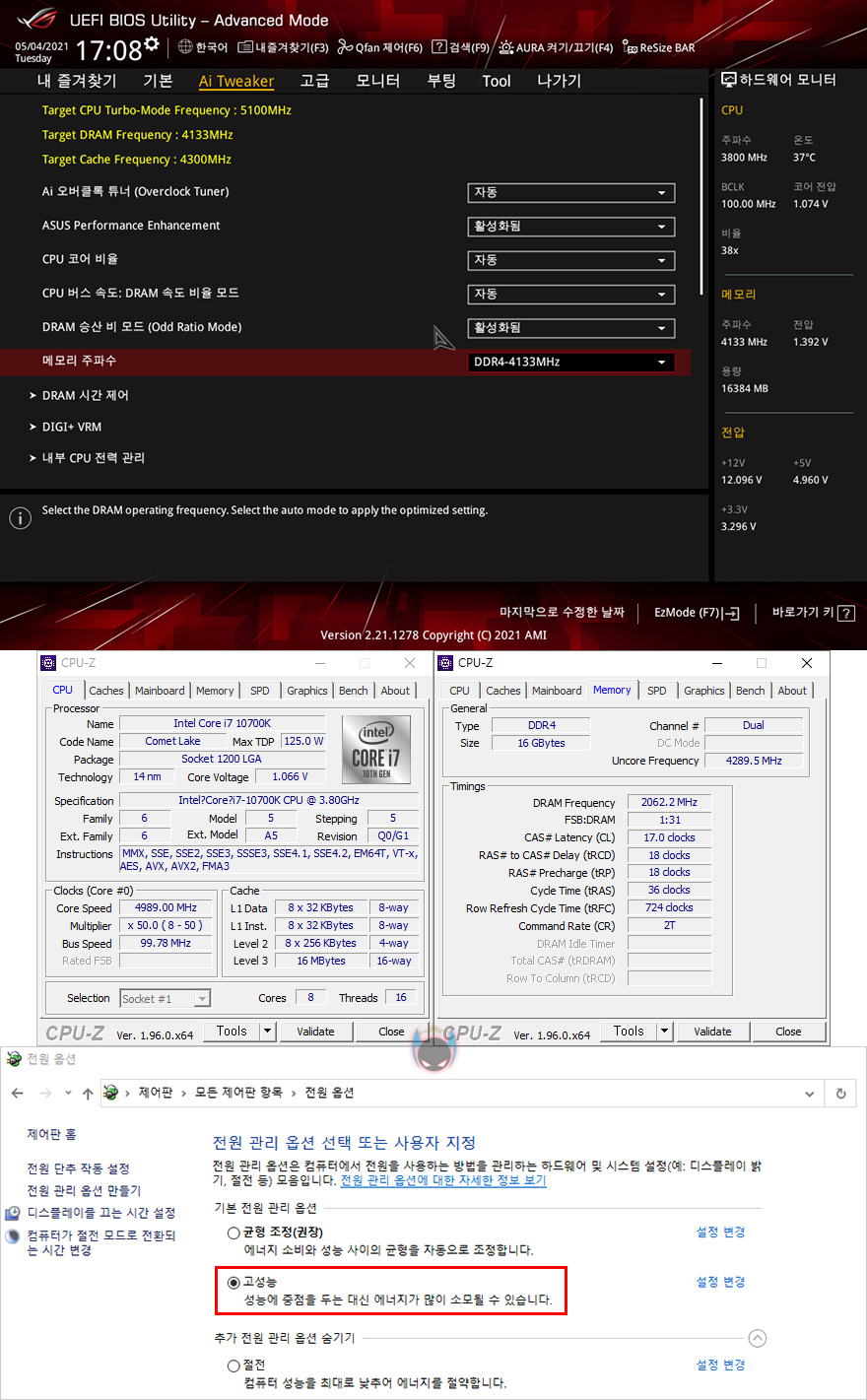 그럼, B560과 H570 메인보드 사용시 가장 최상으로 사용할 수 있는 방법은 무엇일까?! 일단, 메모리가 오버클럭 지원되기 때문에, 사용하는 메모리는 최대한 오버클럭으로 사용하는 것이 좋습니다. 시간적 여유가 된다면 램-타이밍까지 최적으로하면 더 좋겠죠. 그리고, CPU는 Non-K CPU를 사용한다면 전력해제를 해주는 것이 좋고, 오버클럭이되는 K-CPU를 사용했을 때는 굳이 전력해제를 하는 것 보다 윈도우 운영체제의 전원옵션에서 고성능으로 설정하는 것이 더 효율적이라 할 수 있습니다. K-CPU를 B560, H570 메인보드에서 사용하더라도 올-코어(All-Core)는 제한이 되어있기 때문에, 오히려 올-코어보다 최대 부스트클럭으로 사용하는게 더 나을 수 있기 때문입니다. 실제로, i7-10700K CPU를 ASUS ROG Strix B560-G Gaming WiFi 메인보드에서 사용했을 때, 올-코어로 사용하면 4.7GHz까지 제한적이지만, 전원옵션-고성능으로 사용했을 때 부스트클럭이 5GHz까지 작동하는 것을 확인할 수 있습니다. 또한, 최소 클럭도 올-코어처럼 4.7GHz에서 머물죠.