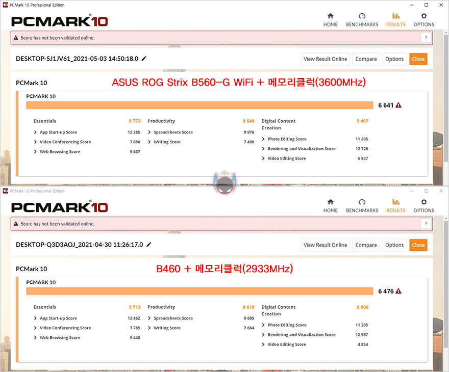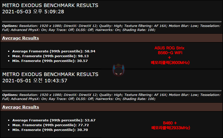 이렇게 B560, H570 메인보드에서 메모리만 오버클럭이 해제되어도 이전 세대 B460, H470 메인보드에 비해 시스템 성능향상이 충분히 높아지죠. 실제 시스템 벤치마크와 게임 벤치마크, 그리고 메모리 영향이 큰 작업에서의 벤치마크 성능을 비교해보면, 이전 세대인 B460 메인보드보다 성능이 높아진 것을 쉽게 확인할 수 있습니다. 그래서, 이제는 데스크탑PC 시장이 6코어이상의 다중코어 시대가 열린 상황에서 CPU 오버클럭이 올-코어(All-Core) 기준으로 해당 CPU의 부스트클럭까지만 도달해도 만족스럽다 할 수 있는 상황이라, 그동안 오버클럭 자체를 지원하지 않았던 B칩셋과 H칩셋 메인보드에서 메모리 오버클럭이 지원되는 것만으로도 소비자입장에선 크게 반가운 점이라 할 수 있습니다.
