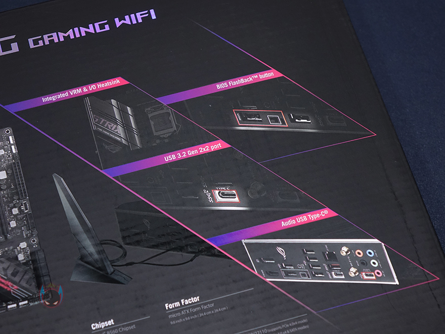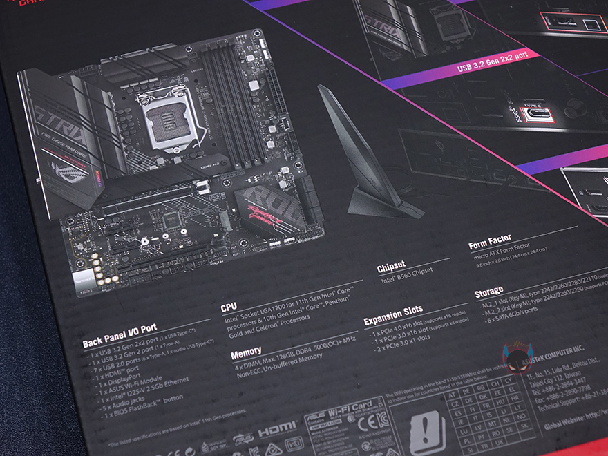 박스 후면에는 제품 풀샷 이미지와 함께 기본 사양 표기를 해놨으며, 풀샷 이미지 오른쪽에 전원부, 바이오스 플래시백 버튼, USB 3.2 Gen2x2 포트, 오디오 USB Type-C 포트 이미지를 추가 특징으료 담고 있죠. 박스를 열어보면, 메인보드는 기본적으로 정전기 방지 비닐에 포장되어 있으며, 제품구성품을 보면 B560 메인보드임에도 ROG 라인업이기 때문에 스티커, 스트랩 제공까지 화려합니다. 전체 구성은 ROG Strix B560-G Gaming WiFi 메인보드, 제품설명서, 로고 스티커, 퀵-가이드, S-ATA 케이블 2개, USB Type-C 케이블, M.2 스크류 및 패드, M2-Q 랜치, 소량의 케이블타이, 스트랩, 드라이버CD, 와이파이 안테나로 이루어져 있습니다.