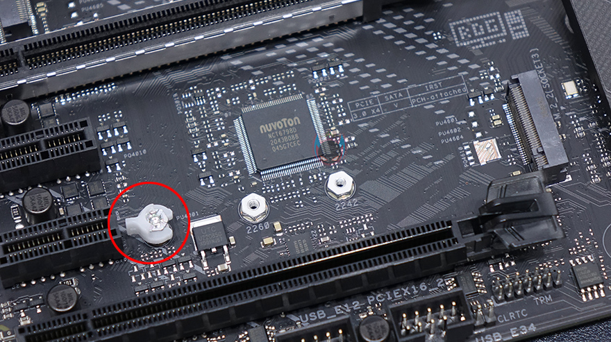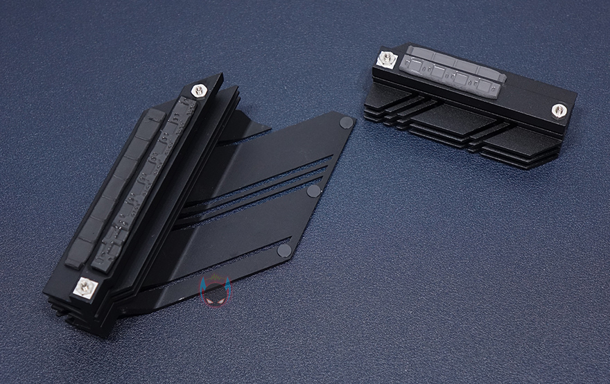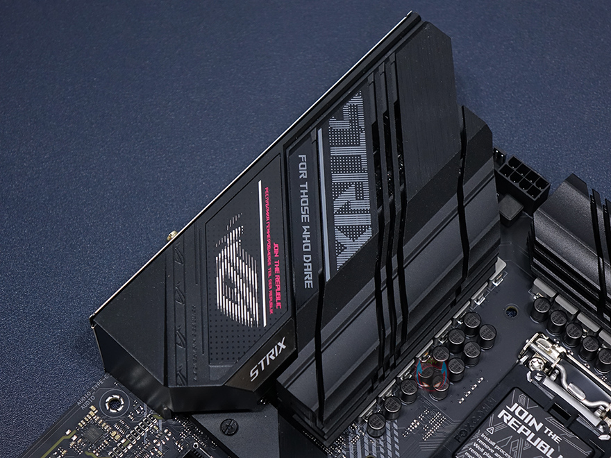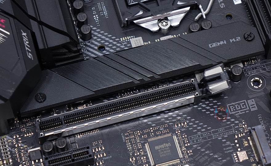 PCI슬롯은 총 4개 구성으로 그래픽카드가 장착되는 1번 PCIe x16 슬롯에는 스틸아머를 적용해 내구성을 강화했으며, 바로 위에는 M.2 SSD 슬롯 자리로 방열판이 장착되어 있는데, 분리하면 내부에 2280, 22110 사이즈 위치에 ASUS가 이번 인텔 11세대 메인보드 제품에서부터 선보이고 있는 무나사 방식의 M.2-Q 랜치가 기본 장착된 것을 확인할 수 있습니다. 물론, M.2 슬롯 아래에도 추가로 하나 더 있으며 역시 M.2-Q 랜치가 적용되어 있죠. 참고로, M.2 SSD 슬롯 1번은 PCIe4.0x4 규격으로 인텔 11세대 CPU 사용 시 사용할 수 있으며, 2번 슬롯은 PCIe3.0x4 규격으로 CPU 세대와 상관없이 사용할 수 있습니다.