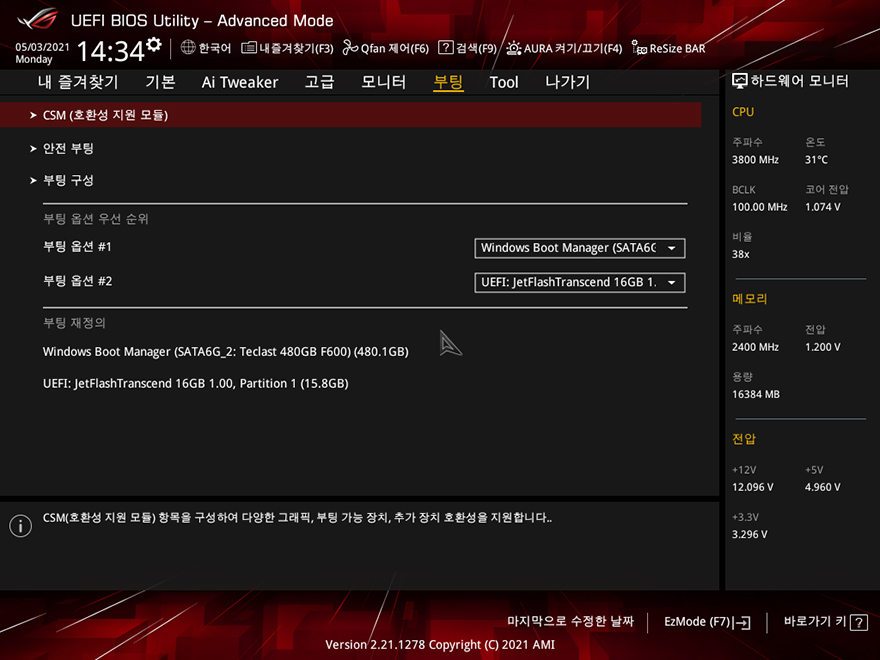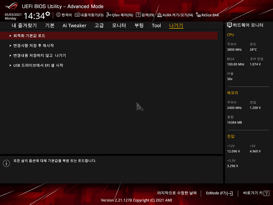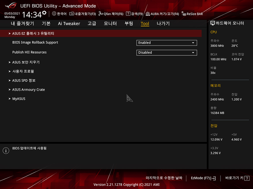 그럼, ASUS ROG Strix B560-G Gaming WiFi 메인보드를 직접 사용해봐야겠죠. 일단, PC를 켜면 메인보드에서 RGB 라이팅효과를 보여주는 부분은 아머부분의 ROG 로고 오른쪽에 위치한 스트릭스 문구에 효과를 보여줍니다. B560 메인보드 특성상 화려한 RGB를 메인보드 자체에 적용하기는 어렵지만, 그래도 ROG 라인업이기때문에 아예 빠지지 않고 넣어줬다라는 점에 충족할 수 있겠습니다. 그리고, 성능 확인 전에 ASUS ROG Strix B560-G Gaming WiFi 메인보드의 CMOS 메뉴를 잠깐 살펴보면, ROG 라인업의 다른 메인보드 제품들과 큰 차이없이 Advanced Mode 대쉬보드 화면에선 크게 기본, Ai 트위커, 고급, 모니터, 부팅, 툴, 나가기 메뉴로 구성되어 있습니다. 참고로, 아직 바이오스는 첫 번째 버전만 나온 상태이기 때문에 별도의 업데이트 진행을 하지 않아도 됩니다.