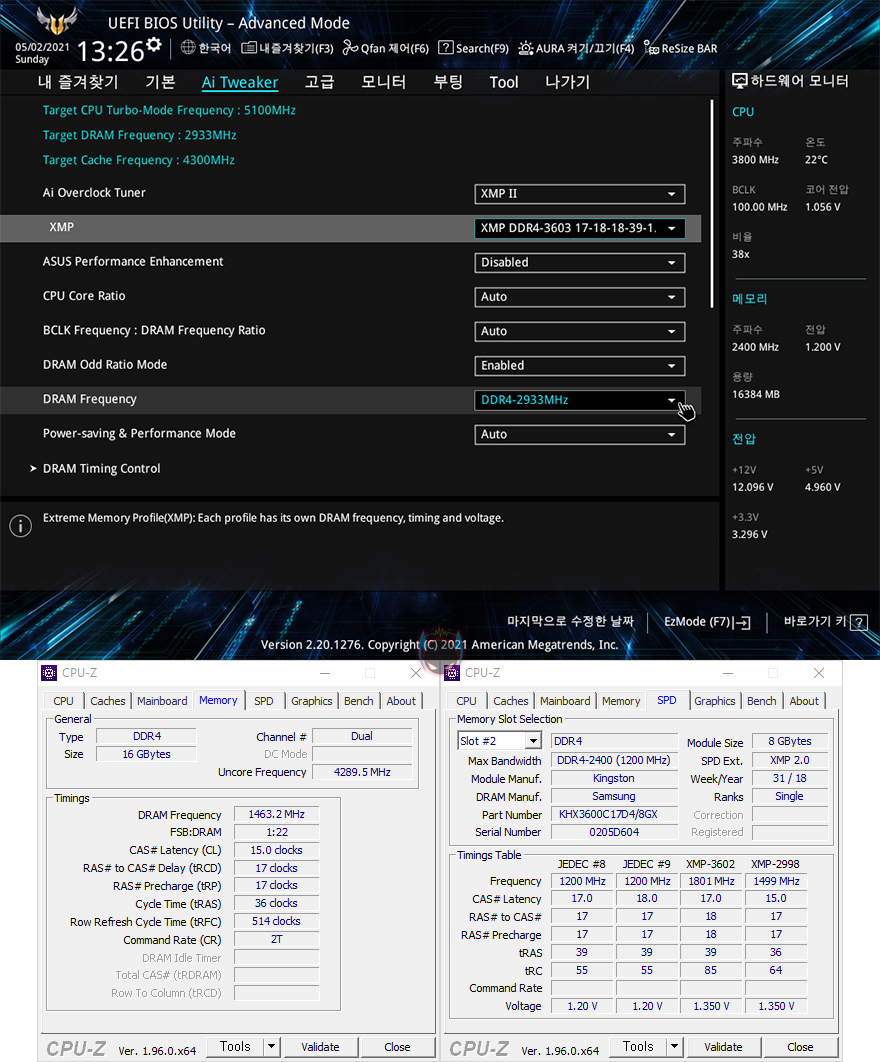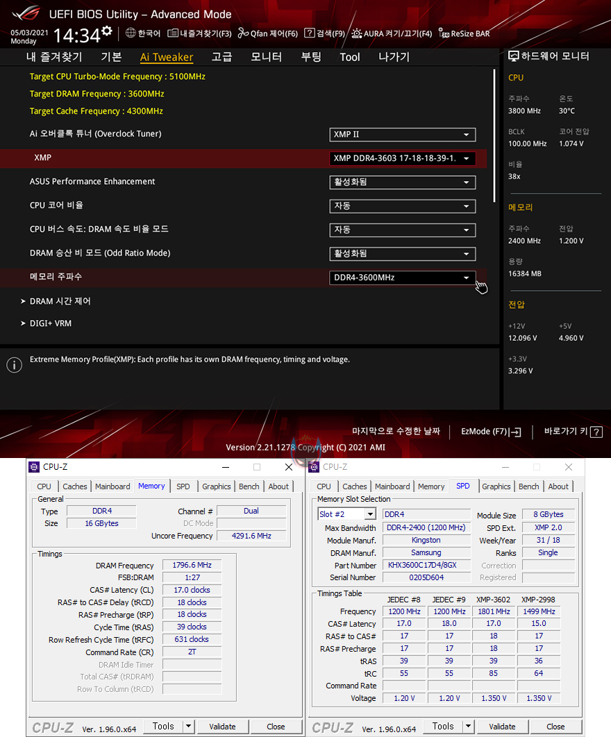 그리고, 앞에서도 언급했지만, 이번 B560 메인보드의 가장 큰 특징은 바로 메모리 오버클럭이 가능해졌다라는 점이죠. 그동안 인텔은 Z칩셋 메인보드에서만 CPU와 메모리 오버클럭이 가능했는데, 이제 B560과 H570 메인보드에서 메모리 오버클럭이 가능해졌습니다. 실제로 이전 세대인 B460 메인보드에서 확인해보면, 인텔 CPU 등급에 따라 i7, i9 CPU는 2933MHz 클럭까지만 작동했기 때문에, X.M.P 프로파일이 적용된 높은 클럭의 메모리를 장착해도 작동은 2933MHz 클럭까지만 했습니다. 하지만, ASUS ROG Strix B560-G Gaming WiFi 메인보드에서는 X.M.P 프로파일에 적용된 높은 클럭까지 적용되어서 작동되는 것을 확인할 수 있죠. 물론, 수동으로 오버클럭이 가능하기 때문에 그 이상 클럭까지도 올릴 수 있습니다.