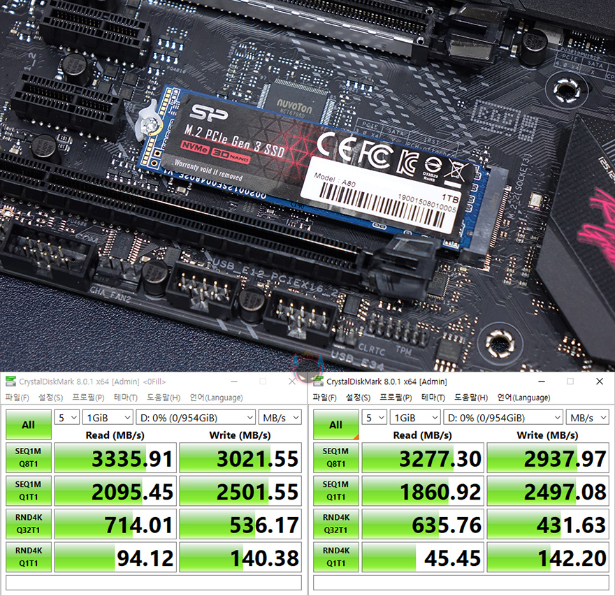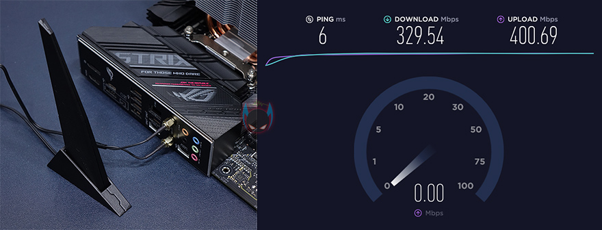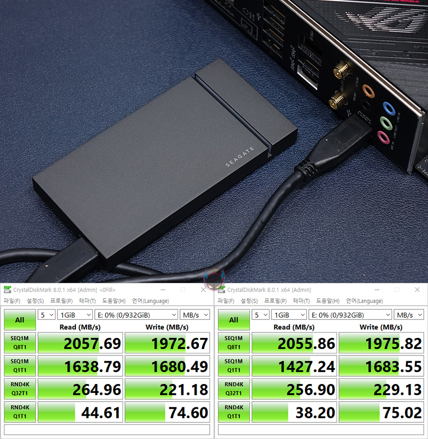 마지막으로 ASUS ROG Strix B560-G Gaming WiFi 메인보드의 일부 부품들의 성능을 확인해보면, M.2 SSD는 인텔 10세대 CPU를 사용했기 때문에 2번 슬롯인 PCIe3.0x4 규격에서 SSD 성능을 확인해봤는데, 규격상 나올 수 있는 최대 속도 3,000MB/s대를 확인할 수 있고, 이번 B560 메인보드에서부터 추가된 백패널 I/O 포트의 USB 3.2 Gen2x2 포트 역시 외장 SSD 규격으로 최신 버전인데, 실제 USB 3.2 Gen2x2 지원 외장 SSD를 사용해본 결과, 2,000MB/s대로 역시 규격과 스펙상의 최상위 속도를 보여줍니다. 그리고, 무선 와이파이6 지원도 갖추고 있어서, 현재 필자가 사용하고 있는 인터넷 유선500Mbps 속도기준에서 무선 속도를 측정해본 결과 300~400Mbps 평균속도가 나오는 것을 확인할 수 있었습니다.