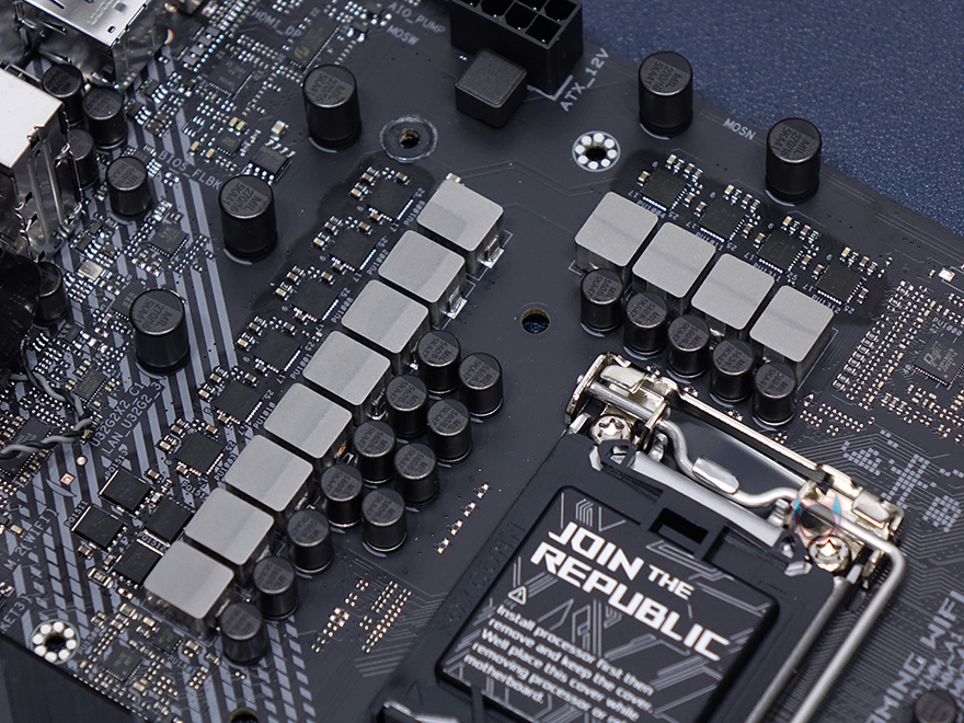 ASUS ROG Strix B560-G Gaming WiFi 메인보드의 전원부는 총 10(8+2)페이즈 구성으로 모스펫이 Dr.MOS로 디지털 전원부를 갖추고 있습니다. 모스펫은 Vishay Siliconix사의 SiC639 칩셋으로 최대 전압출력 50A를 갖추고 있는데, 이전 세대 메인보드에서도 상급 모델에 사용되었던만큼 B560칩셋 메인보드 제품치고는 탄탄한 전원부를 가졌다할 수 있습니다. 물론, 캐패시터도 TUF 시리즈에 사용되는 제품들로 구성되었죠. 그리고, 전원부 컨트롤로 ASUS Digi+ 파워컨트롤 칩셋도 당연히 탑재되었습니다.