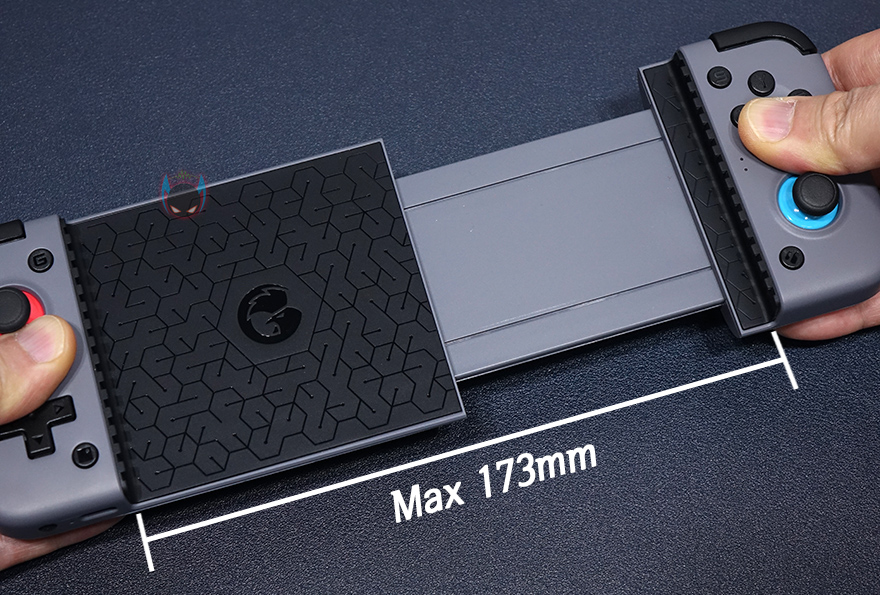 그리고, 가운데부분에는 모바일기기가 장착되는 부위로 기기를 미끄럼방지와 함께 그립고정되도록 패드를 부착해놨으며, 패드 가운데 Gamesir 로고도 새겨놨습니다. X2 블루투스버전 역시 양쪽으로 당기면 모바일기기를 장착할 수 있게 늘어나는데, USB Type-C버전 2021모델부터 최대 173mm까지 확장지원되었는데, 블루투스버전도 동일하게 지원합니다. 173mm면 스마트폰 기준으로 7인치가 넘는 길이가 사실상 시중에 판매되고 있는 스마트폰들은 모두 장착이 된다고 보면 됩니다. 그리고, 양쪽 고정그립부분에도 패드가 부착되어 있죠.