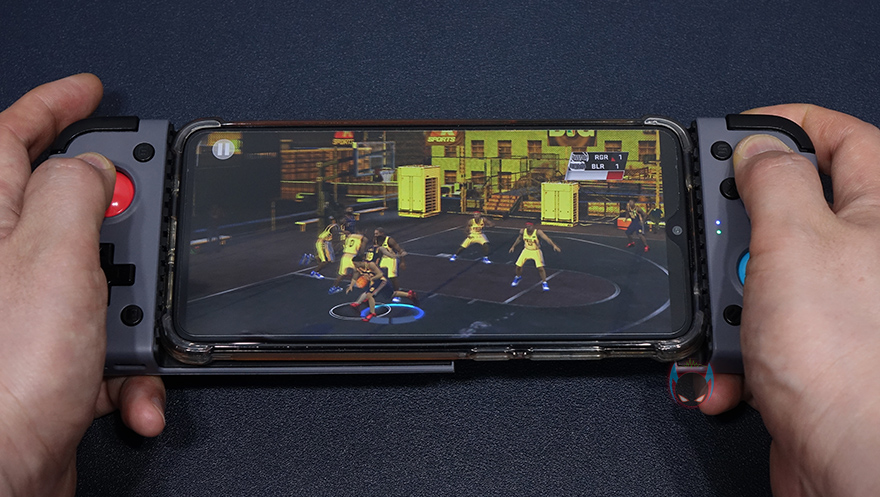 X2 블루투스버전 모델은 말그대로 블루투스 연결방식이기 때문에 스마트폰 같은 모바일기기와 페어링 연결을 해주면 되는데, 연결이 되면 오른쪽 조이콘부분에 LED 인디케이터를 통해 연결상태를 확인할 수 있습니다. 그리고, 그립 같은경우에는 엄지와 집게 손가락을 제외하고 나머지 손가락이 게임패드 후면 고무패드 그립부분을 잡기때문에 미끌림없이 편하게 그립을 할 수 있습니다. 전체적으로 그립감은 편하며, 트리거 버튼은 앞서 말한대로 마우스 버튼에 사용되는 스위치가 사용되었기 때문에 눌렀을 때, 마우스버튼 같은 느낌으로 익숙함을 줍니다.