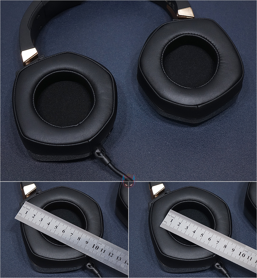 이어-컵부분은 양쪽 모두 동일한 디자인으로 곡선형의 육각형 디자인을 가졌고, 뒤에서 확인하겠지만, 라인형태로 RGB라이팅효과를 적용하고 있습니다. 그리고, 안쪽의 이어-패트부분은 인조가죽 사용과 함께 쿠션 형태로 적용하고 있는데, 여기서도 조금 아쉬운 점은 패드 자체는 100mm 크기정도로 패드 자체의 크기는 나쁘지 않은데, 귀를 덮는 부분은 약 60mm 크기의 원형으로 귀를 완전히 덮기에는 사용자에 따라 차이가 있을 수 있겠습니다. 오히려 타워형 모양이었으면 좀 더 귀를 쉽게 완전히 덮지 않았을까 생각이 듭니다. 그리고, 내부에는 53mm 대형 유닛이 탑재되어 있고, 왼쪽 이어-컵에는 분리형 마이크와 연결되는 포트가 배치되어 있습니다.