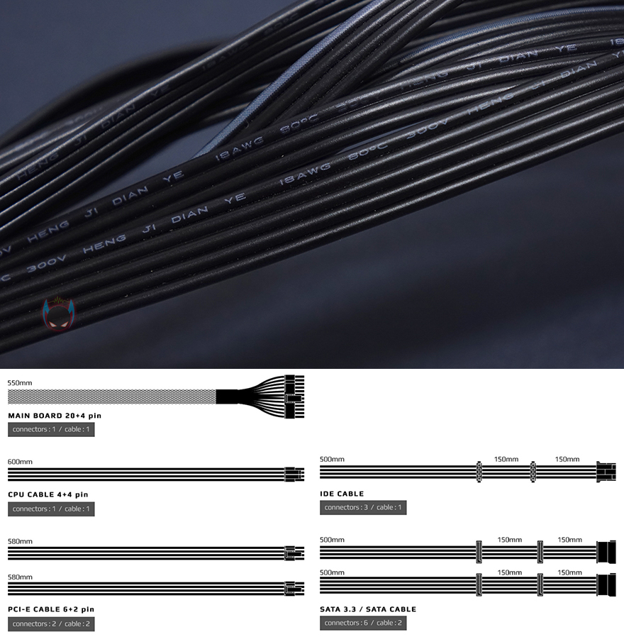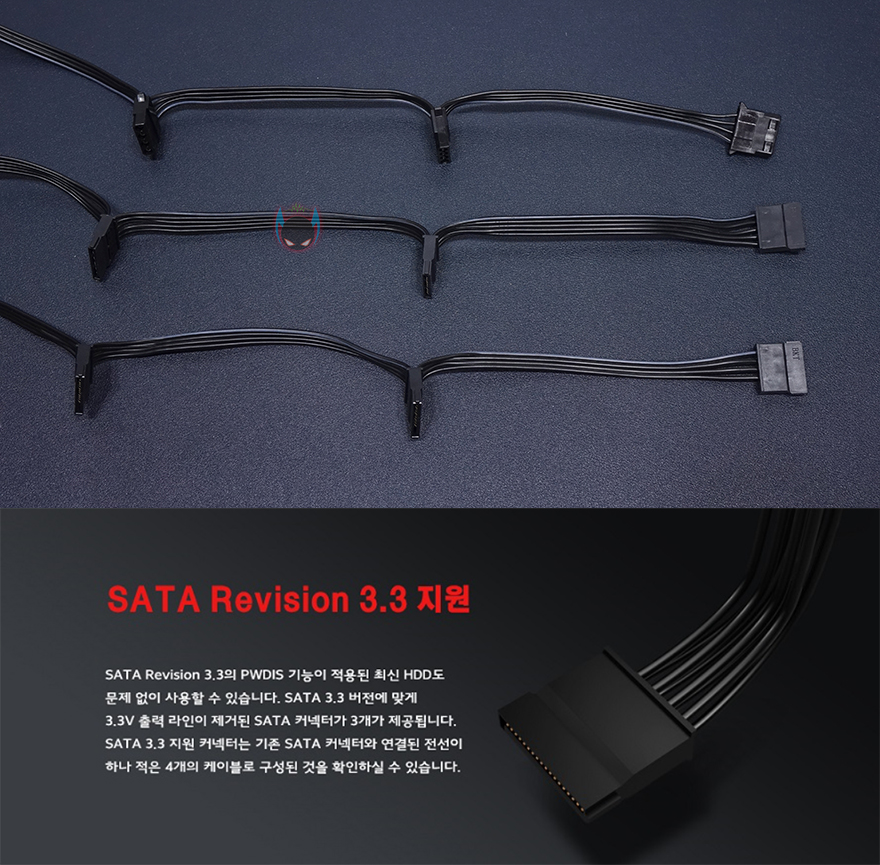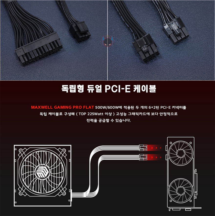 이번에 맥스웰 게이밍프로 600W 파워서플라이의 케이블과 커넥터 구성을 확인해보는데, 케이블은 메인보드 전원케이블은 슬리빙처리를 했으며, 나머지 케이블들은 모두 플랫(Flat)타입을 가졌습니다. 전선규격은 파워서플라이가이드 표준에 맞춘 18AWG를 사용했으며, 케이블 길이는 요즘 PC케이스에 맞춰 충분히 넉넉한 길이를 가지고 있죠. 커넥터 구성 같은경우에는 메인보드 24(20+4)핀과 ATX보조전원 8(4+4)핀을 비롯해, 그래픽카드 보조전원 PCIe 8(6+2)핀 2개를 갖추고 있는데, 각각 독립케이블로 적용했습니다. 동급 제품들에서 대부분 하나의 케이블에 2개를 적용하는 경우가 많은데, 이 제품은 각각 독립케이블로 적용하고 있어서 좀 더 확실하게 그래픽카드에 전력공급을 전달할 수 있게 해주고 있습니다. 그리고, S-ATA 커넥터 같은경우에는 총 6개 중 3개는 최신규격 그러니깐 3.3V 출력을 뺀 PWDIS 기능 적용의 SATA 3.3버전을 적용하고 있죠. 또한, P-ATA 커넥터도 3개를 갖추고 요즘은 거의 사용하지 않는 FDD 커넥터를 제외시켰습니다. 그러니깐 요즘 시대에 맞춘 커넥터 구성을 가지고 있는거죠.