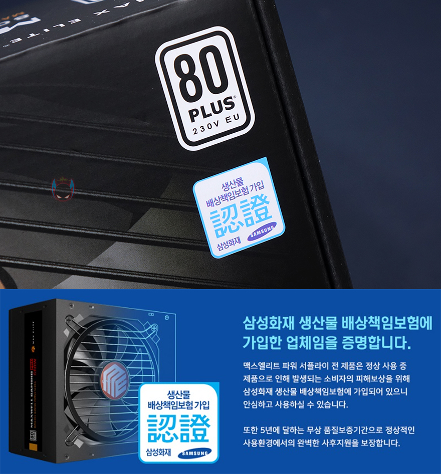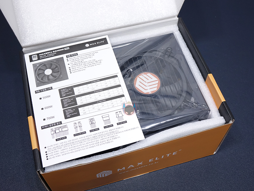 그리고, 80플러스 스탠다드 인증 마크와 함께 또하나의 마크 표기를 확인할 수 있는데, 바로 배상책임보험이죠. 이러한 소비자 서비스보험도 모든 파워서플라이 업체들이 가입하고 있는 것이 아니기 때문에, 소비자입장에선 좀 더 눈길을 가질 수 있는 부분입니다. 그리고, 박스 후면에는 제품의 기본사양 정보와 앞에서 확인한 제품의 주요특징을 확인 한 번 표기된 것을 확인할 수 있으며, 박스를 열어보면 제품포장은 우레탄-폼 완충제를 사용해 외부충격 파손방지가 되도록 했으며, 제품구성은 맥스웰 게이밍프로 600W 파워서플라이, 전원케이블, 장착에 사용되는 나사, 케이블정리에 사용되는 케이블타이, 제품설명서 제공으로 이루어져 있습니다.