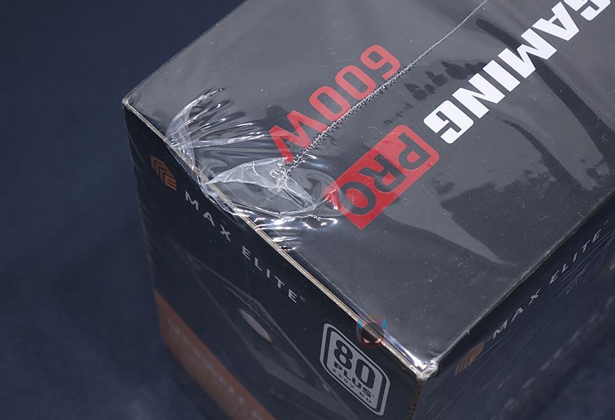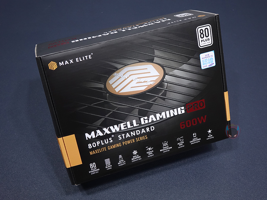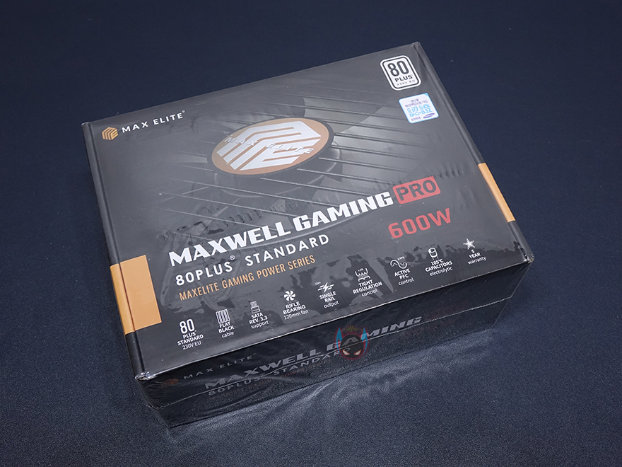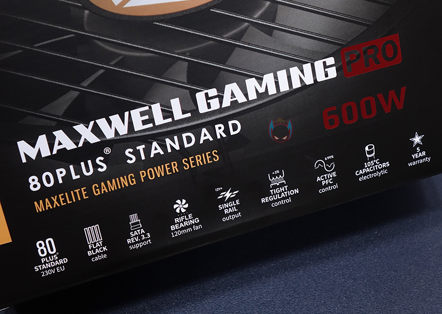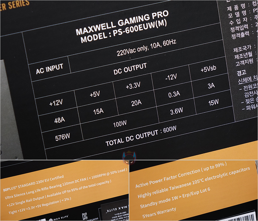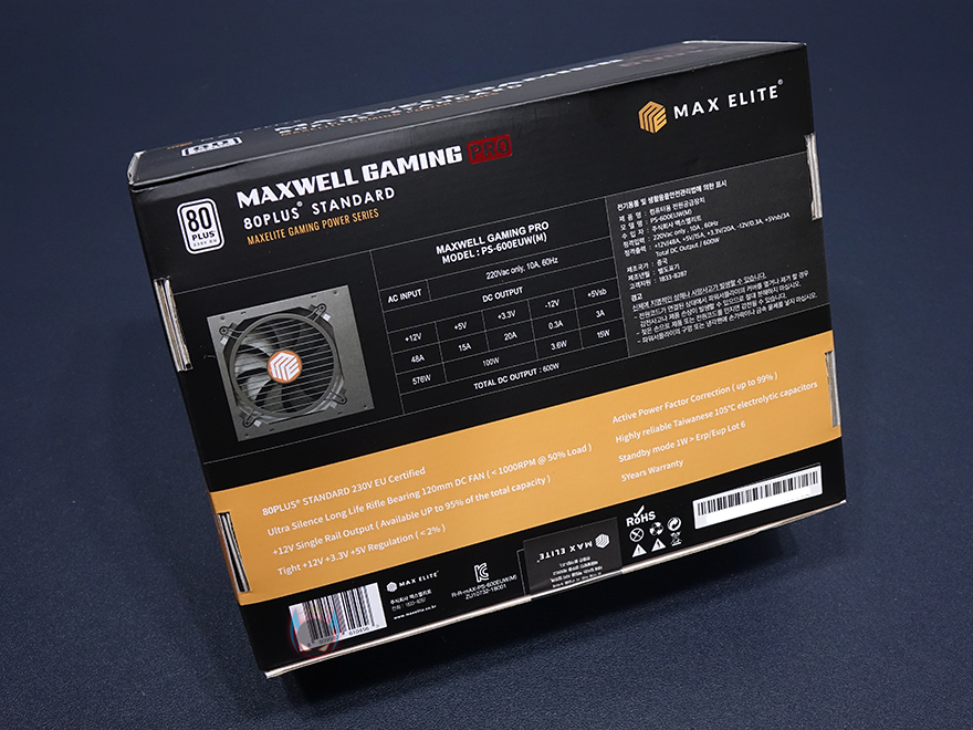 맥스엘리트는 글로벌 파워서플라이 브랜드로 유명한 시소닉을 국내유통 맡고있는 업체로고 잘 알려져 있는데, 보통 이런 유명 파워서플라이 브랜드 유통을 맡는 업체들은 자사 브랜드의 파워서플라이 제품에도 꽤 신경을 쓰는 편입니다. 실제 맥스웰 게이밍프로 600W 제품을 보면 시소닉 제품들처럼 박스전체를 밀봉처리해서 판매하고 있죠. 소비자입장에선 단순 동봉스티커보다는 좀 더 신뢰감을 가질 수 있는 팩키지처리입니다. 물론, 비닐을 제거하면 박스 오픈부분에 동봉스티커까지 적용되어 있습니다. 박스 전면에는 모델명과 함께 제품의주요 특징을 아이콘형식으로 표기해놨는데, 총 9개 표기로 80플러스 스탠다드 인증을 시작으로 플랫케이블, S-ATA 최신버전, 자동 팬속도조절, 싱글레일, 최소 전압변동, 액티브PFC, 고온에서 견딜 수 있는 캐패시터, 5년 무상보증입니다.