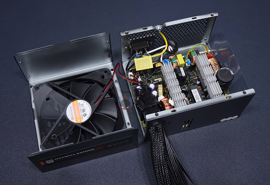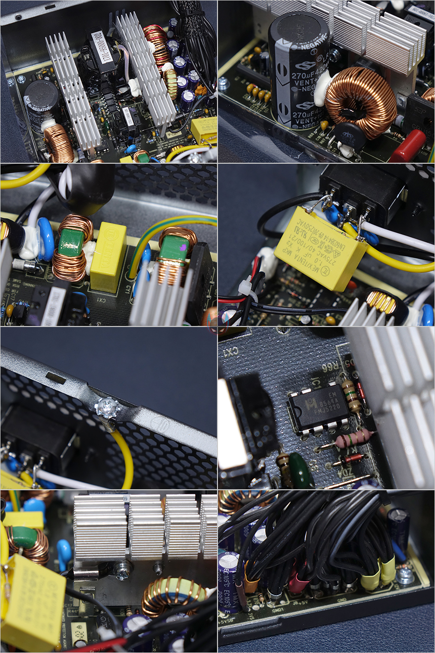 이번엔 맥스웰 게이밍프로 600W 파워서플라이의 본체 내부를 간단히 살펴보는데, 내부에 장착된 120mm 팬은 에어가드를 적용해 공기흐름이 흐트러지지 않게 해놨으며, 총 9개의 블레이드(날개)를 갖추고 있습니다. 그리고, 내부에는 2개의 알루미늄 히트싱크와 안정적인 전력공급을 위해 스위칭트랜스, 105℃에서도 견딜 수 있는 270㎌/420V 메인 캐패시터와 전력효율99%를 위한 액티브PFC, 고주파음 최소화의 이중 EMI필터, 내부전류흐름방지의 접지, 7가지 보회회로가 적용된 Excelliance MOS사의 칩셋, 자동 팬 속도조절을 위한 온도센서, 깔끔하게 처리된 출력부를 확인할 수 있습니다. 전반적으로 내부 구성은 탄탄하다 할 수 있습니다.