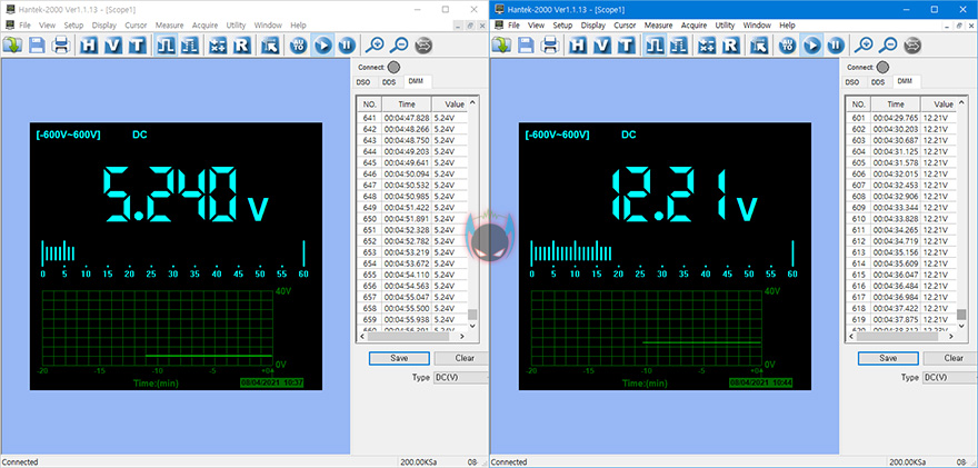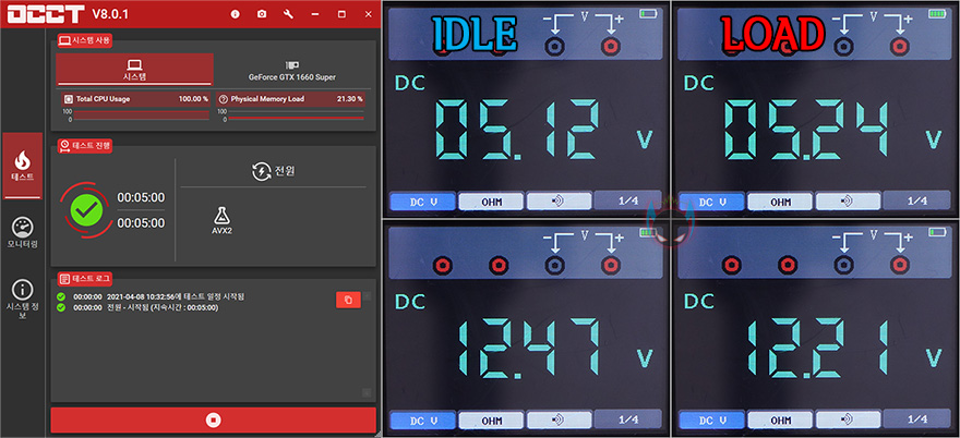 실제로 OCCT 프로그램을 통해 IDLE과 LOAD 각 상황에서 맥스웰 게이밍프로 600W의 12V와 5V 전압 움직임을 확인해보면, 각 상황에서 각 전압 모두 0.01~0.02V의 매우 낮은 폭에서 움직이는 것을 확인할 수 있었고, 전체 변동폭도 0.1~0.2V 범위로 낮은 편인 것을 확인할 수 있어서, 전력이 안정적으로 공급된다라는 것을 알 수 있습니다.