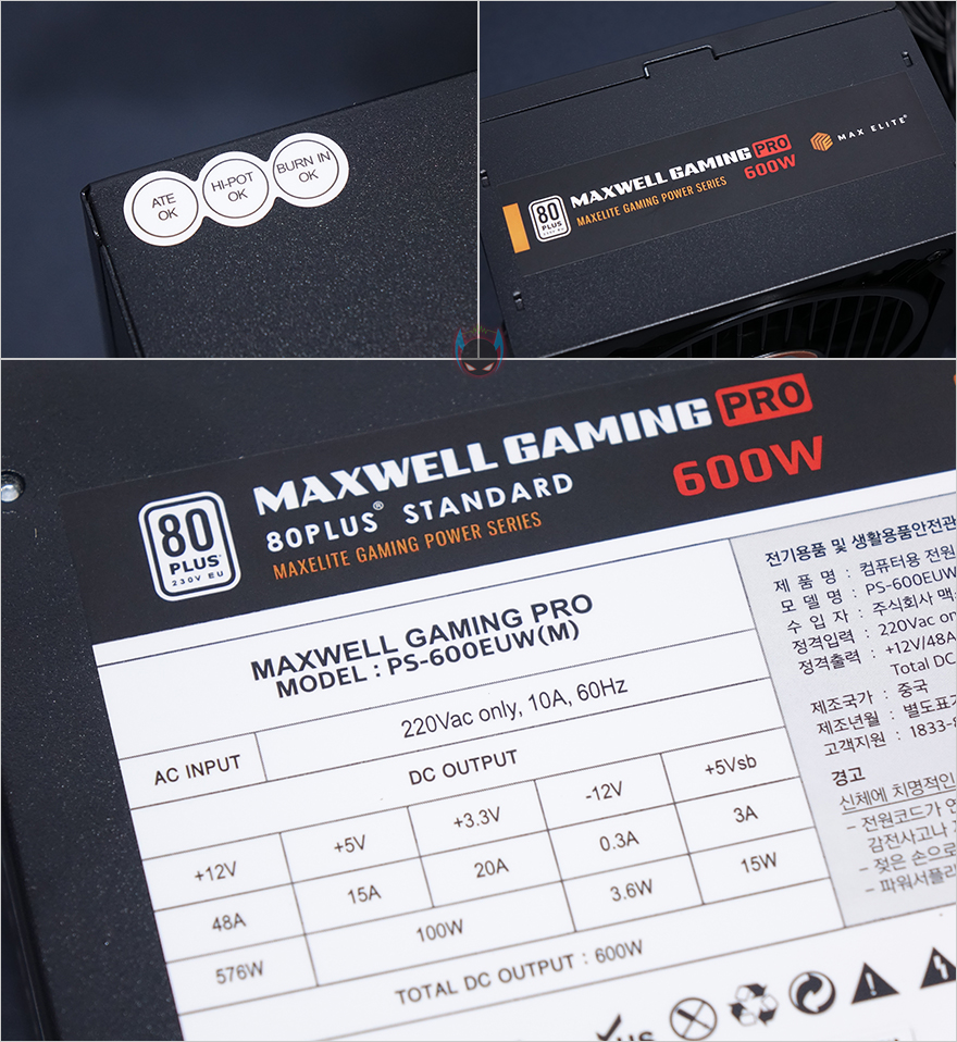 맥스엘리트 맥스웰 게이밍프로 600W 파워서플라이 외형을 살펴보면, 먼저 본체 같은경우 깊이 길이가 140mm로 최근 이런 ATX파워 제품들이 꽤 많아졌죠. 즉, 용량은 커지면서 본체 깊이 길이는 ATX파워 최소 길이인 140mm를 갖추고 있다라는겁니다. 이렇게 최소 깊이 길이를 가지게 되면, 최근 PC케이스 제품들이 하단에 파워서플라이가 장착되고, 컴팩트한 미들타워 케이스들이 추세라는 점에서 케이스 내부에 파워서플라이 케이블정리를 할 수 있는 여유공간을 좀 더 확보할 수 있다라는 이점이 있죠. 그리고, 본체 내부에 쿨링 역할로 120mm 팬 장착과 함께 팬 그릴도 적용되어 있는데, 요즘 가격경쟁을 벌이는 제품들 중에서는 본체 샤시 자체에 팬 그릴 디자인을 적용하는 경우가 많은데, 이 제품은 그래도 별도의 팬 그릴까지 적용하고 있어서 나중에 파워서플라이 청소를 할 때 분리해서 확실히 청소할 수 있게 해줍니다. 당연히 후면 배기부는 벌집모양의 에어홀처리를 해놨고, 전면에 케이블출력구도 깔끔하게 밴딩 마감처리를 해놨습니다. 이 밖에 품질통과 인증도 확인할 수 있으며, 측면에 제품명, 본체 밑바닥부분에 다시 한 번 해당 제품의 기본사양을 확인할 수 있죠.