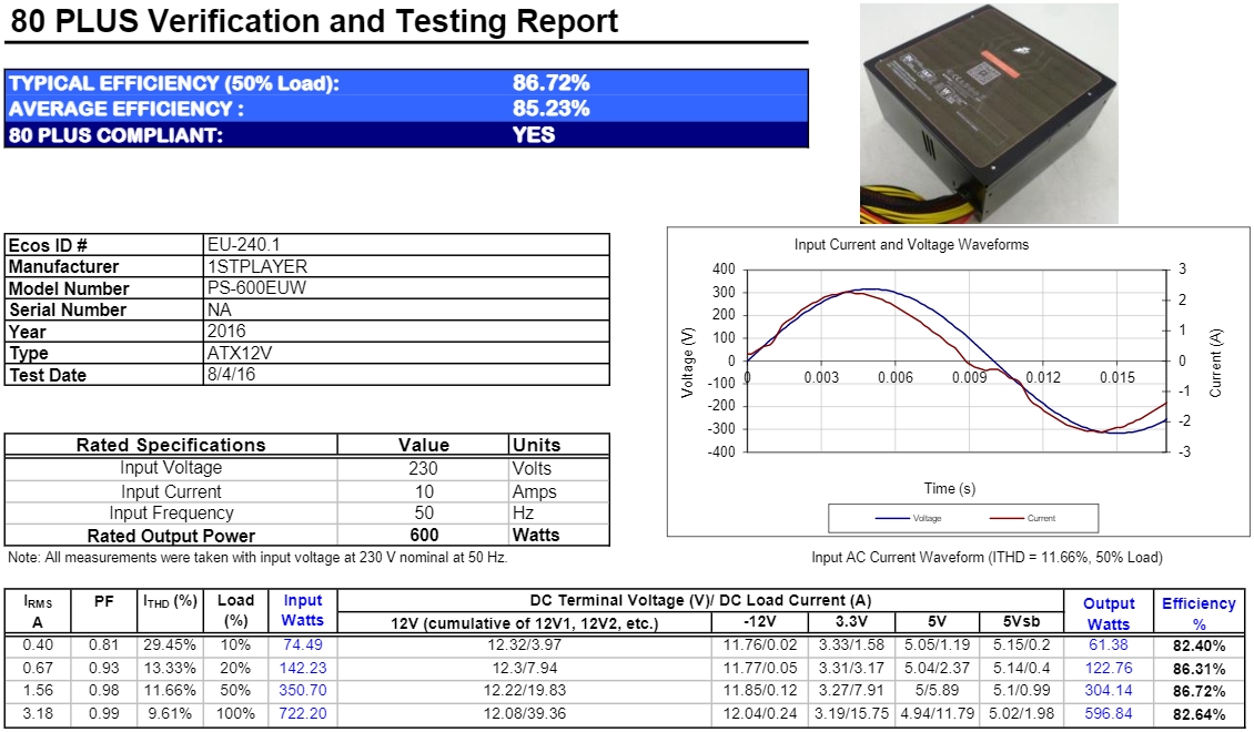그리고, 앞서 표기에서 확인했듯이 맥스웰 게이밍프로 600W 모델은 국내 220V 표준전압과 호환되는 유럽 230V 기준에서 80플러스 스탠다드 인증을 받았는데, 실제 80플러스 사이트에 등록된 해당 모델의 전력효율을 확인해보면, 평균적으로 많이 사용되는 20%와 50% 부하시에서 약 86%의 전력효율을 가지고 있는 것을 확인할 수 있습니다. 또한, 기본 작동상태에서 팬 소음을 측정해보면, 약 40dB(A)수준으로 소음기준에서도 정숙한 편에 속하는 것을 확인할 수 있죠. 이정도 소음이면, 실제 PC케이스 내부에 장착해서 사용할 시 다른 부품들의 소음에 묻힌다고 볼 수 있습니다.
