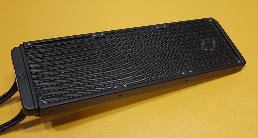 앱코의 Ncore L360 RGB 일체형 수냉쿨러 제품을 살펴보면, 일단 라디에이터 같은경우 구성품에서 미리 확인했듯이 120mm 팬이 3개 제공되기 때문에 3열(360mm) 라디에이터 크기를 가졌습니다. 기본 팬 3개를 제공하지만, 앞뒤로 모두 팬을 장착할 수 있기때문에, 최대 6개까지 장착해서 듀얼 팬 구성을 할 수 있죠. 방열핀들은 깔끔하게 정렬이 되어있으며, 라디에이터 두께는 표준이라 할 수 있는 27mm를 가졌습니다.