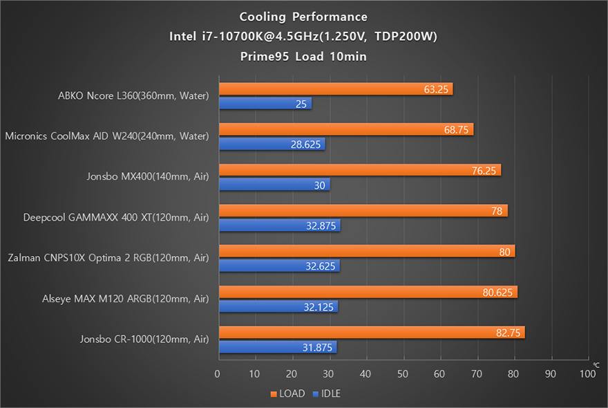 끝으로, 앱코 Ncore L360 일체형 수냉쿨러의 냉각성능을 확인해보는데, 인텔 i7-10700K CPU를 TDP 200W 수준의 4.5GHz 클럭으로 고정해서 공랭 쿨러와 240mm 일체형 수냉쿨러를 포함해 Prime95를 실행해 10분간 과부하상태에서 냉각성능을 비교해 본 결과, 3열 360mm 라디에이터답게 Ncore L360 일체형 수냉쿨러가 가장 냉각성능이 좋은 것으로 나오는 것을 확인할 수 있었습니다. 특히, 240mm 일체형 수냉쿨러와도 약 5℃ 가까이 차이를 두고 있어서, 메인보드의 전원부나 CPU 수율에 따라서 더 높은 클럭으로 설정해도 충분한 냉각성능을 보여줄 것으로 생각됩니다.