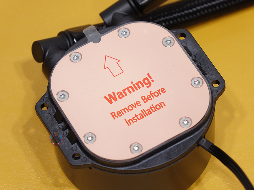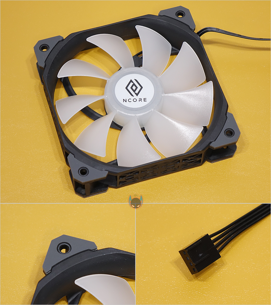 라디에이터와 워터블록을 연결하는 튜브는 총 400mm 길이에 튜브 자체 재질은 고무지만, 흠집방지를 위해 직조 슬리빙처리를 적용해놨습니다. 요즘 일체형 수냉쿨러 제품들에는 거의 기본적으로 적용이 되고 있는 부분이기도하죠. 그리고, 라디에이터 연결부와 워터블록 연결부 모두 누수 발생이 생기지 않도록 깔끔하게 밀폐 하우징처리를 해놨습니다. 워터블록 같은경우에는 상단에 엔코어(Ncore) 로고를 새겨놨으며, 박스에서 미리 확인했듯이 작동시 RGB라이팅효과를 볼 수 있고, 펌프 연결방식은 3핀이며, 2800(±10%)RPM 속도를 가졌습니다. 그리고, 베이스와 맞닿는 베이스부분은 다른 일체형 수랭쿨러 제품들처럼 구리재질 그대로 매그럽고 깔끔하게 래핑처리르 해놨습니다. 참고로, 사용전에 보호비닐이 부착되어 잇기 때문에 사용할 때는 제거하고 사용해야합니다.