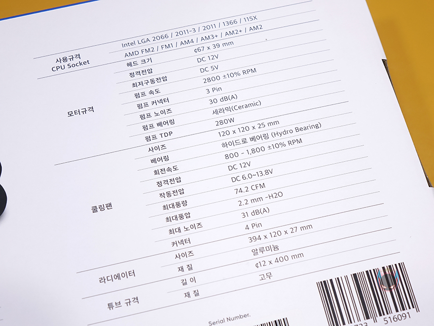 제품 팩키지형태는 다른 일체형 수냉쿨러 제품들처럼 박스형태이며, 포장은 박스전체까지 밀봉처리를 했습니다. 비슷한 가격대의 제품들 중 박스 밀봉처리가 안된 제품들도 있기때문에, 나름 포장에 신경을 썼고, 소비자입장에서도 판매제품에 신뢰를 가질 수 있겠습니다. 박스 전면에는 제품 이미지를 담고 있는데, 팬과 워터블록에 RGB 라이팅효과가 적용되었다라는 것을 미리 알 수 있고, 모델명과 함께 3년 무상보증기간 표기도 확인할 수 있습니다. 박스 후면에는 제품의 기본사양을 상세하게 표기해놨는데, 소켓규격, 워터블록, 팬, 라디에이터, 튜브 각 부위별로 나뉘어 표기를 해 구입 전에 쉽게 사양 파악을 할 수 있죠.