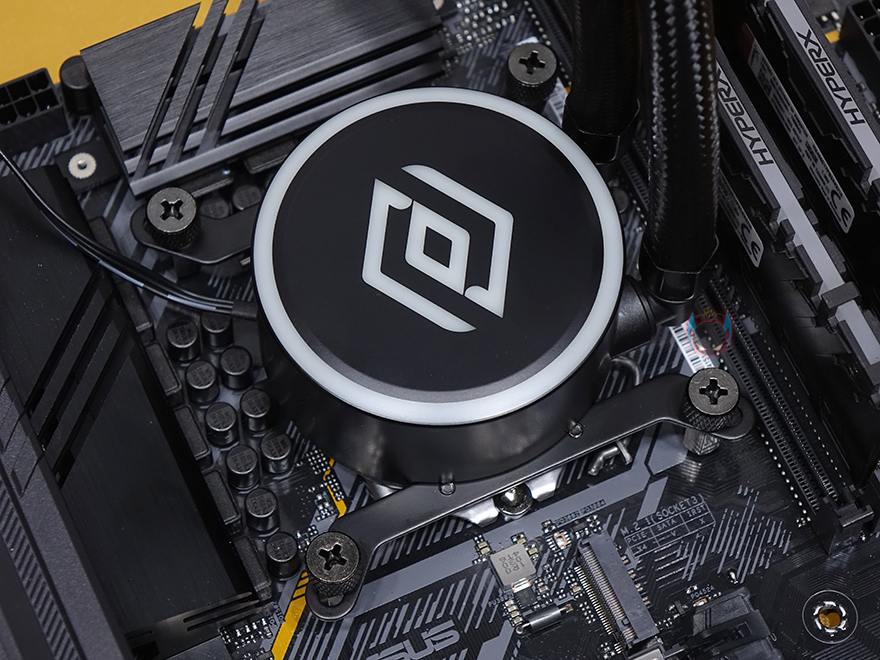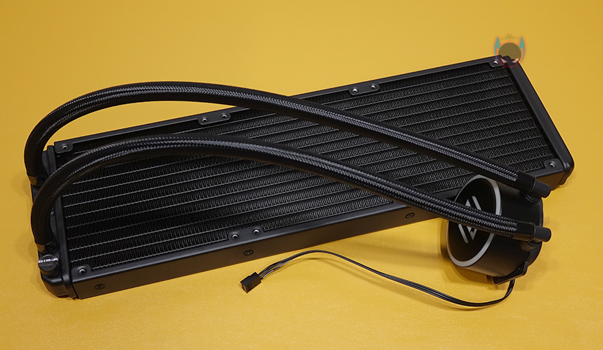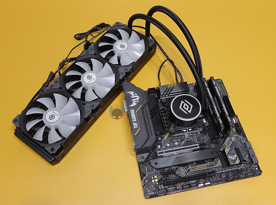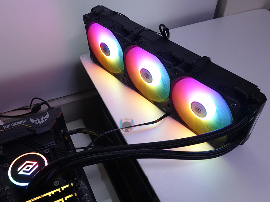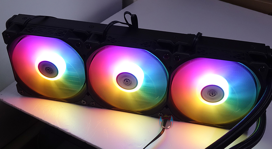 장착 후, PC를 켜보면 라디에이터에 장착된 120mm 팬들과 워터블록 상단 로고부분에서 RGB라이팅 효과를 바로 확인할 수 있습니다. 별도의 모드 지원없이 고정 RGB로 작동하며, 개인적으로는 워터블록보다 팬 RGB효과가 좀 더 명확해보였습니다. 메인보드 RGB Sync 연동을 지원하기 않기때문에 일부 소비자들은 아쉽다 느낄 수 있겠지만, 비슷한 가격대 동급 제품들 대부분이 메인보드 RGB Sync를 지원하지 않기 때문에 크게 아쉬워할 필요는 없겠습니다.
