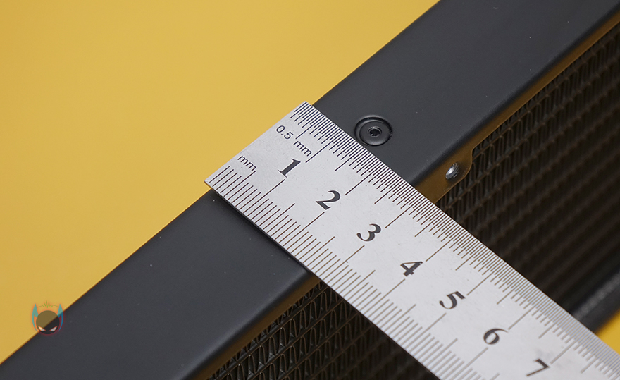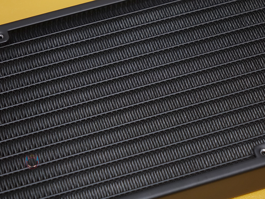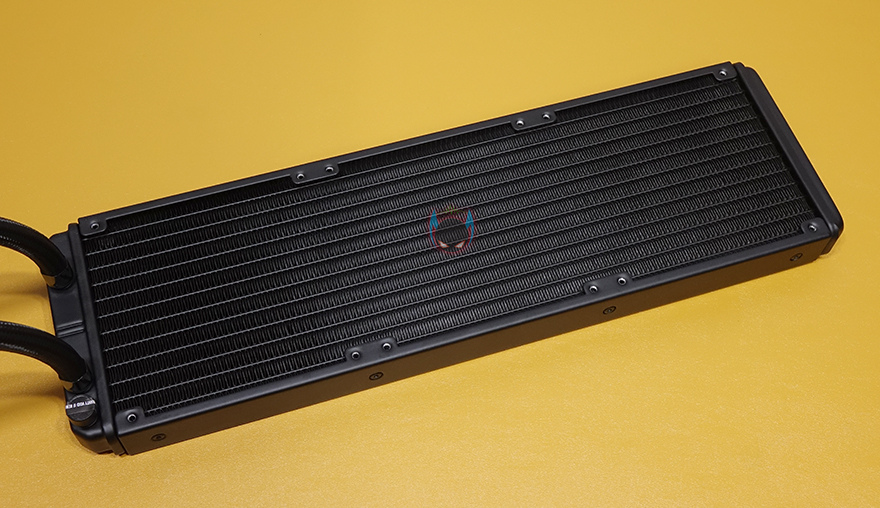 앱코의 Ncore L360 RGB 일체형 수냉쿨러 제품을 살펴보면, 일단 라디에이터 같은경우 구성품에서 미리 확인했듯이 120mm 팬이 3개 제공되기 때문에 3열(360mm) 라디에이터 크기를 가졌습니다. 기본 팬 3개를 제공하지만, 앞뒤로 모두 팬을 장착할 수 있기때문에, 최대 6개까지 장착해서 듀얼 팬 구성을 할 수 있죠. 방열핀들은 깔끔하게 정렬이 되어있으며, 라디에이터 두께는 표준이라 할 수 있는 27mm를 가졌습니다.