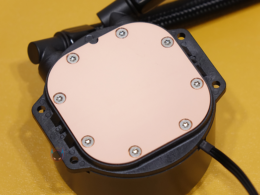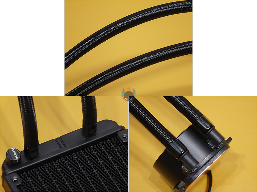 라디에이터와 워터블록을 연결하는 튜브는 총 400mm 길이에 튜브 자체 재질은 고무지만, 흠집방지를 위해 직조 슬리빙처리를 적용해놨습니다. 요즘 일체형 수냉쿨러 제품들에는 거의 기본적으로 적용이 되고 있는 부분이기도하죠. 그리고, 라디에이터 연결부와 워터블록 연결부 모두 누수 발생이 생기지 않도록 깔끔하게 밀폐 하우징처리를 해놨습니다. 워터블록 같은경우에는 상단에 엔코어(Ncore) 로고를 새겨놨으며, 박스에서 미리 확인했듯이 작동시 RGB라이팅효과를 볼 수 있고, 펌프 연결방식은 3핀이며, 2800(±10%)RPM 속도를 가졌습니다. 그리고, 베이스와 맞닿는 베이스부분은 다른 일체형 수랭쿨러 제품들처럼 구리재질 그대로 매그럽고 깔끔하게 래핑처리르 해놨습니다. 참고로, 사용전에 보호비닐이 부착되어 잇기 때문에 사용할 때는 제거하고 사용해야합니다.