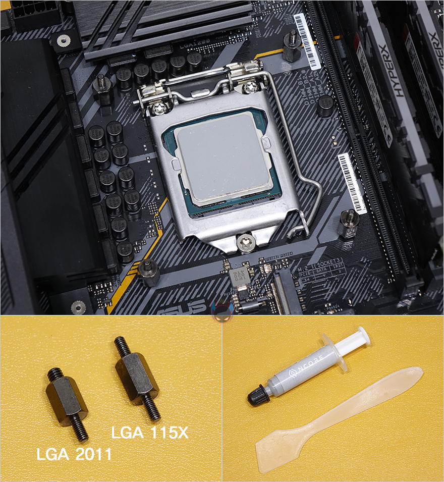 이번엔 백플레이트를 사용하는데, 참고로 AMD는 백플레이트를 사용할 필요가 없고, 인텔 같은경우에도 LGA 2011 소켓 CPU를 사용한다면 백플레이트를 사용할 필요가 없습니다. 백플레이트는 인텔용 LGA 115x/1200용이니깐요. 그래서, 필자는 백플레이트를 메인보드 후면에 장착하고, 역시 인텔용 LGA 115x용과 1200용 고정볼트를 구분해서, LGA 115x 고정볼트로 메인보드에 결합해주면 됩니다. 그리고, 제공되는 써멀컴파운드를 CPU에 도포해주면 되는데, 쉽게 바를 수 있게 주걱 스틱을 함께 제공해주고 있습니다. 백플레이트까지 메인보드에 장착했다면, 최종적으로 워터블록을 CPU 위에 올려서 제공되는 너트를 사용해 백플레이트 고정볼트와 결합해주면, 장착이 마무리 됩니다.