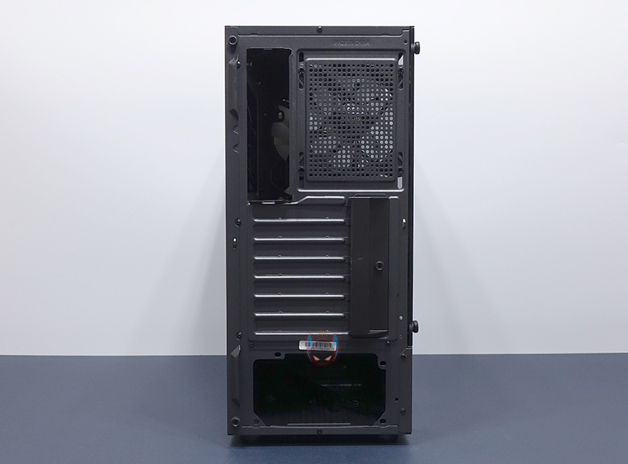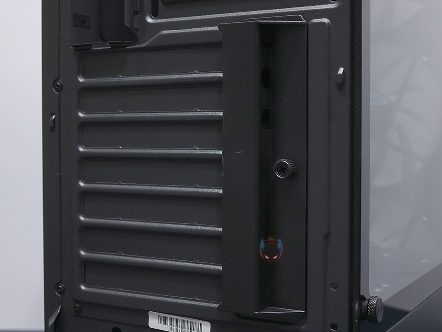 사이드 패널은 전면에서 봤을 때, 오른쪽 패널은 기본 민무늬 형태의 샤시 자체 패널이며, 왼쪽 패널은 약 75% 면적의 강화유리 패널을 적용했습니다. 즉, 나머지 아랫부분은 패널이 아닌 고정 샤시라는 거죠. 그리고, 기본적으로 강화유리에는 개봉 시 보호비닐이 부착되어 있는데, 아직까지 강화유리 PC케이스에 비산방지필름을 적용하는 제품들이 없기 때문에, 일반적으로 개봉시 부착된 보호비닐이 투명하게 잘 부착되어 있으며, 강화유리 파손방지로 사용하는 경우가 있는데, N4 i40은 반투명 보호비닐에 완전히 유리를 덮고 있는 상태가 아니기 때문에, 사실상 사용 시에는 비닐을 제거해야 하겠습니다. 그리고, 양쪽 패널 모두 고정은 핸드스크류를 사용하고 있어서, 도구를 사용하지 않아도 손쉽게 분리할 수 있습니다.