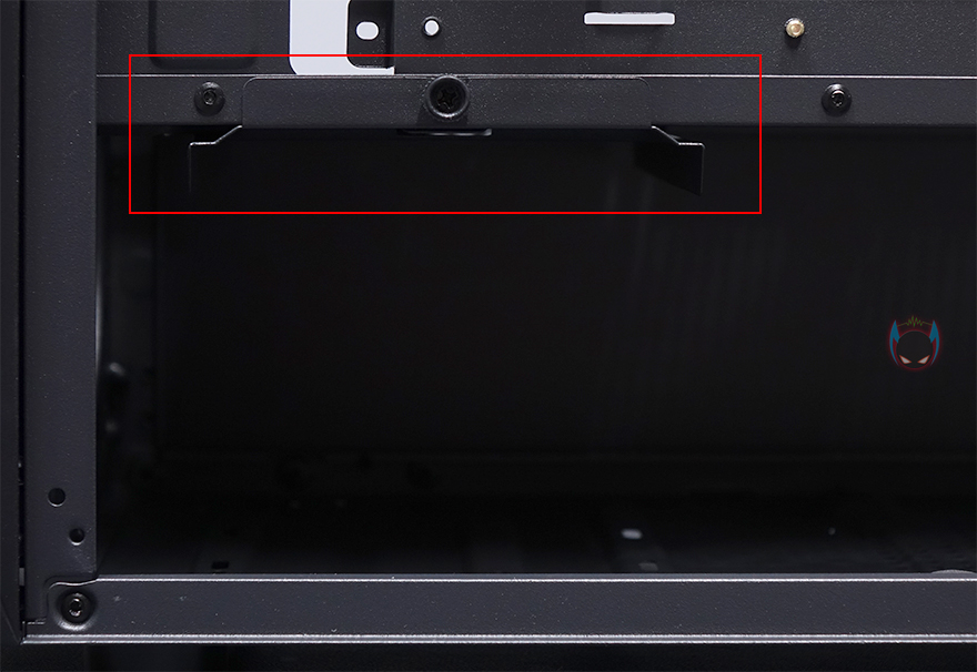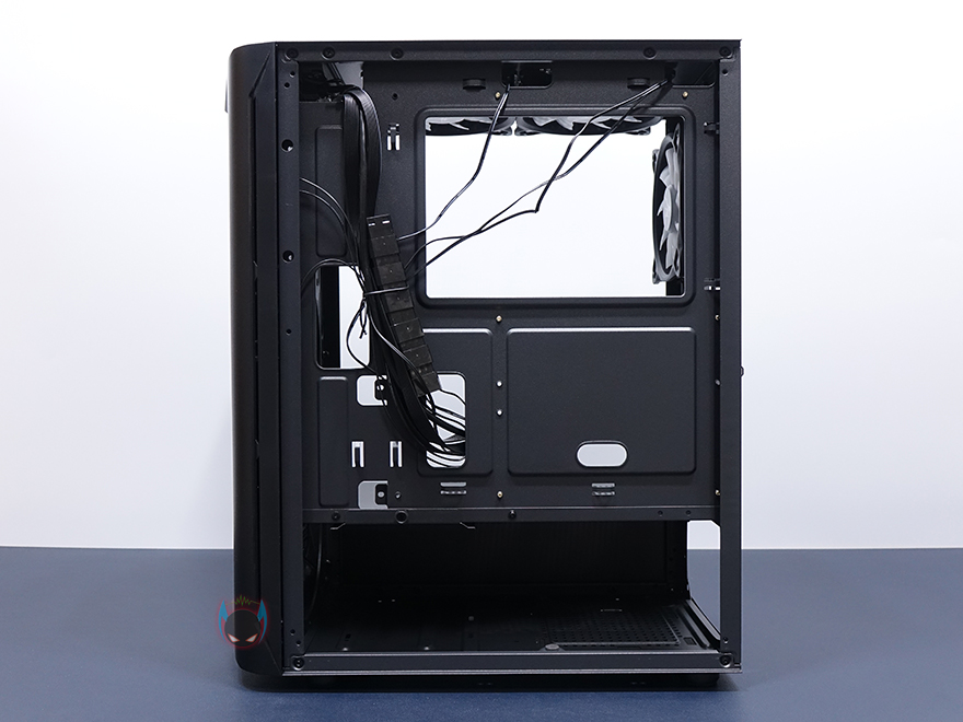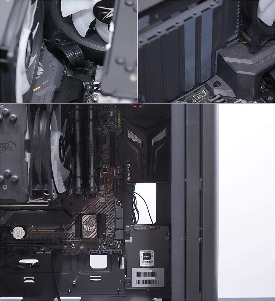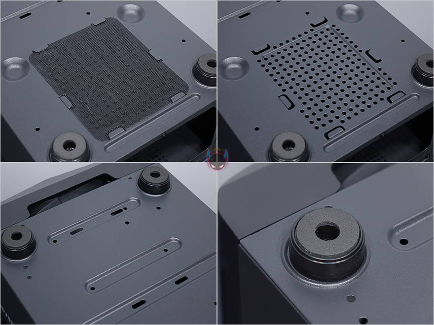 내부 하단은 요즘 PC케이스 트랜드처럼 커버를 적용해놨는데, 커버 상단에 에어홀 처리와 함께 추가로 120mm 팬을 2개 더 장착할 수 있게 나사홀까지 적용되어 있습니다. 그리고, 안쪽으로 역시 케이블 정리를 위해 선정리홀도 일부 적용되어 있죠. 커버가 적용되었기 때문에, 파워서플라이는 반대편인 오른쪽에서 장착할 수 있는데, 기본 받침대와 고무 패드가 부착된 것을 확인할 수 있죠. 그리고, 앞자리에는 저장장치를 장착할 수 있는 위치로 윗부분에 핸드스크류로 베이를 장착하고 있는데, 핸드스크류를 풀면 쉽게 분리되는 베이는 3.5인치 HDD나 2.5인치 HDD/SSD를 1개 장착할 수 있습니다. 그리고, 앞서 외부 케이스 밑바닥부분에서 언급했듯이, 내부 밑바닥부분에도 HDD/SSD 1개를 장착할 수 있죠. 물론, 내부 구성에 따라서 사용하지 않아도 됩니다. 물론, 사용하지 않으면 그만큼 케이블 정리공간이 많이 확보는거죠.