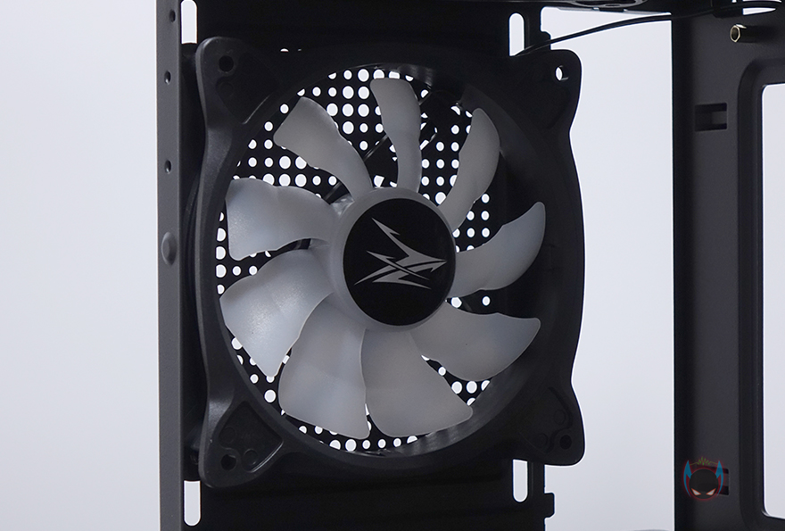이번엔 잘만 N4 i 40 강화유리 PC케이스 내부를 살펴보는데, 내부는 요즘 트랜드처럼 외부베이가 없는 형태로 메인보드가 장착되는 트레이부분에는 아주 큼지막한 CPU 컷-아웃을 비롯해, 케이블 정리를 수월하게 할 수 있도록 주변에 선정리홀을 처리해놨습니다. 메인보드는 기본적으로 ATX, M-ATX, 미니ITX까지 장착할 수 있죠. 그리고, 앞자리에는 2.5인치 HDD/SSD를 2개 장착할 수 있게 지원하고 있습니다. 내부 상단에는 120mm RGB 팬이 기본 장착되어 있는데, 9개의 블레이드(날개)를 가진 팬으로 연결방식은 P-ATA 방식입니다. 그리고, 후면 역시 동일한 120mm RGB 팬이 배기역할로 장착되어 있죠. PCI슬롯가이드는 모두 일회용으로 적용되어 있습니다.