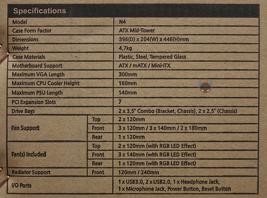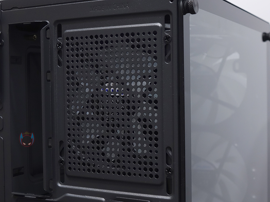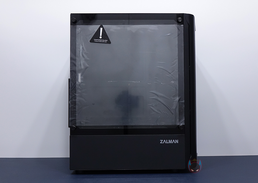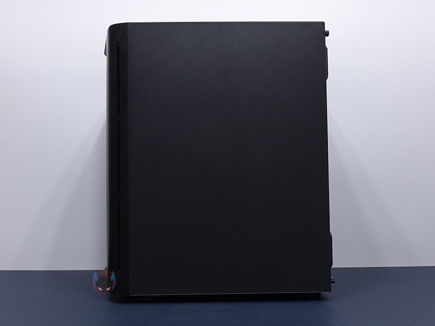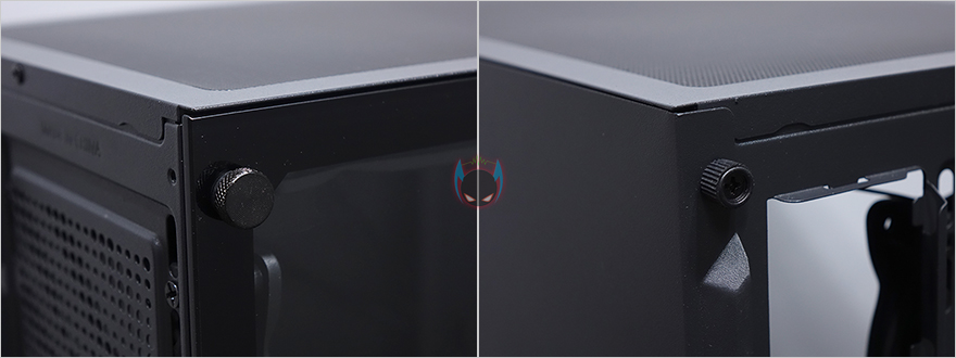 사이드 패널은 전면에서 봤을 때, 오른쪽 패널은 기본 민무늬 형태의 샤시 자체 패널이며, 왼쪽 패널은 약 75% 면적의 강화유리 패널을 적용했습니다. 즉, 나머지 아랫부분은 패널이 아닌 고정 샤시라는 거죠. 그리고, 기본적으로 강화유리에는 개봉 시 보호비닐이 부착되어 있는데, 아직까지 강화유리 PC케이스에 비산방지필름을 적용하는 제품들이 없기 때문에, 일반적으로 개봉시 부착된 보호비닐이 투명하게 잘 부착되어 있으며, 강화유리 파손방지로 사용하는 경우가 있는데, N4 i40은 반투명 보호비닐에 완전히 유리를 덮고 있는 상태가 아니기 때문에, 사실상 사용 시에는 비닐을 제거해야 하겠습니다. 그리고, 양쪽 패널 모두 고정은 핸드스크류를 사용하고 있어서, 도구를 사용하지 않아도 손쉽게 분리할 수 있습니다.