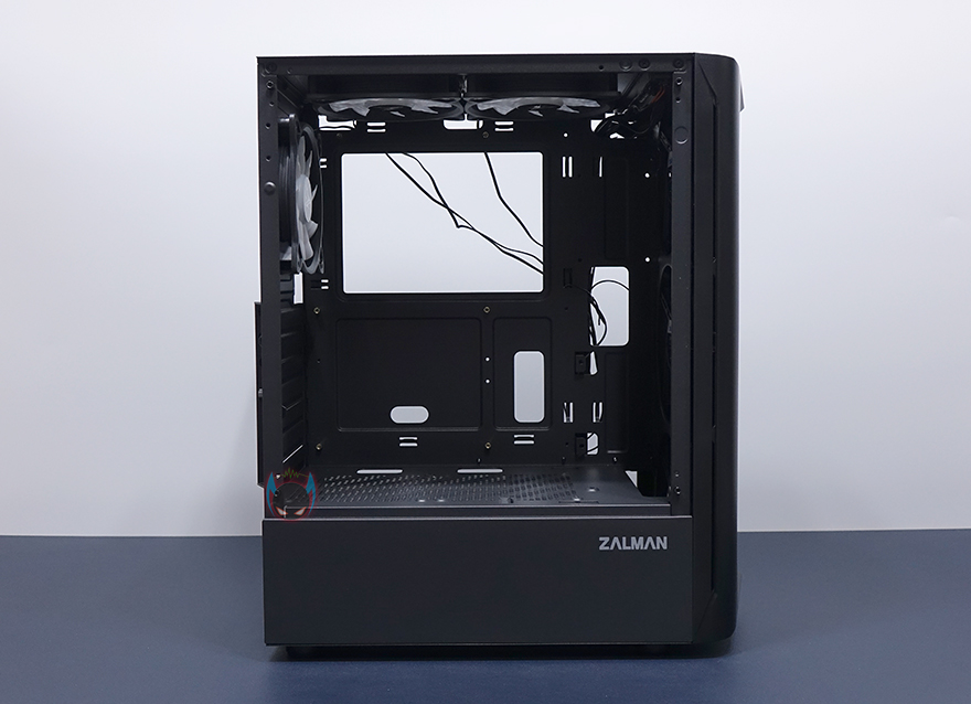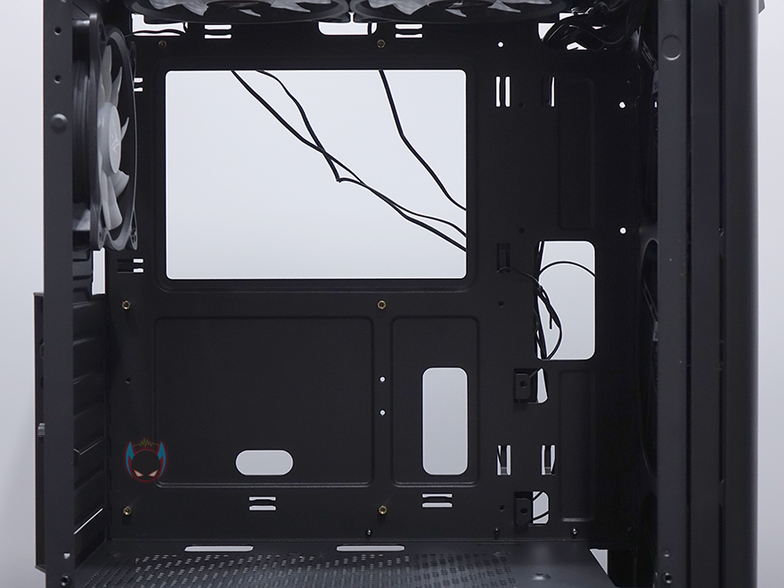 이번엔 잘만 N4 i 40 강화유리 PC케이스 내부를 살펴보는데, 내부는 요즘 트랜드처럼 외부베이가 없는 형태로 메인보드가 장착되는 트레이부분에는 아주 큼지막한 CPU 컷-아웃을 비롯해, 케이블 정리를 수월하게 할 수 있도록 주변에 선정리홀을 처리해놨습니다. 메인보드는 기본적으로 ATX, M-ATX, 미니ITX까지 장착할 수 있죠. 그리고, 앞자리에는 2.5인치 HDD/SSD를 2개 장착할 수 있게 지원하고 있습니다. 내부 상단에는 120mm RGB 팬이 기본 장착되어 있는데, 9개의 블레이드(날개)를 가진 팬으로 연결방식은 P-ATA 방식입니다. 그리고, 후면 역시 동일한 120mm RGB 팬이 배기역할로 장착되어 있죠. PCI슬롯가이드는 모두 일회용으로 적용되어 있습니다.